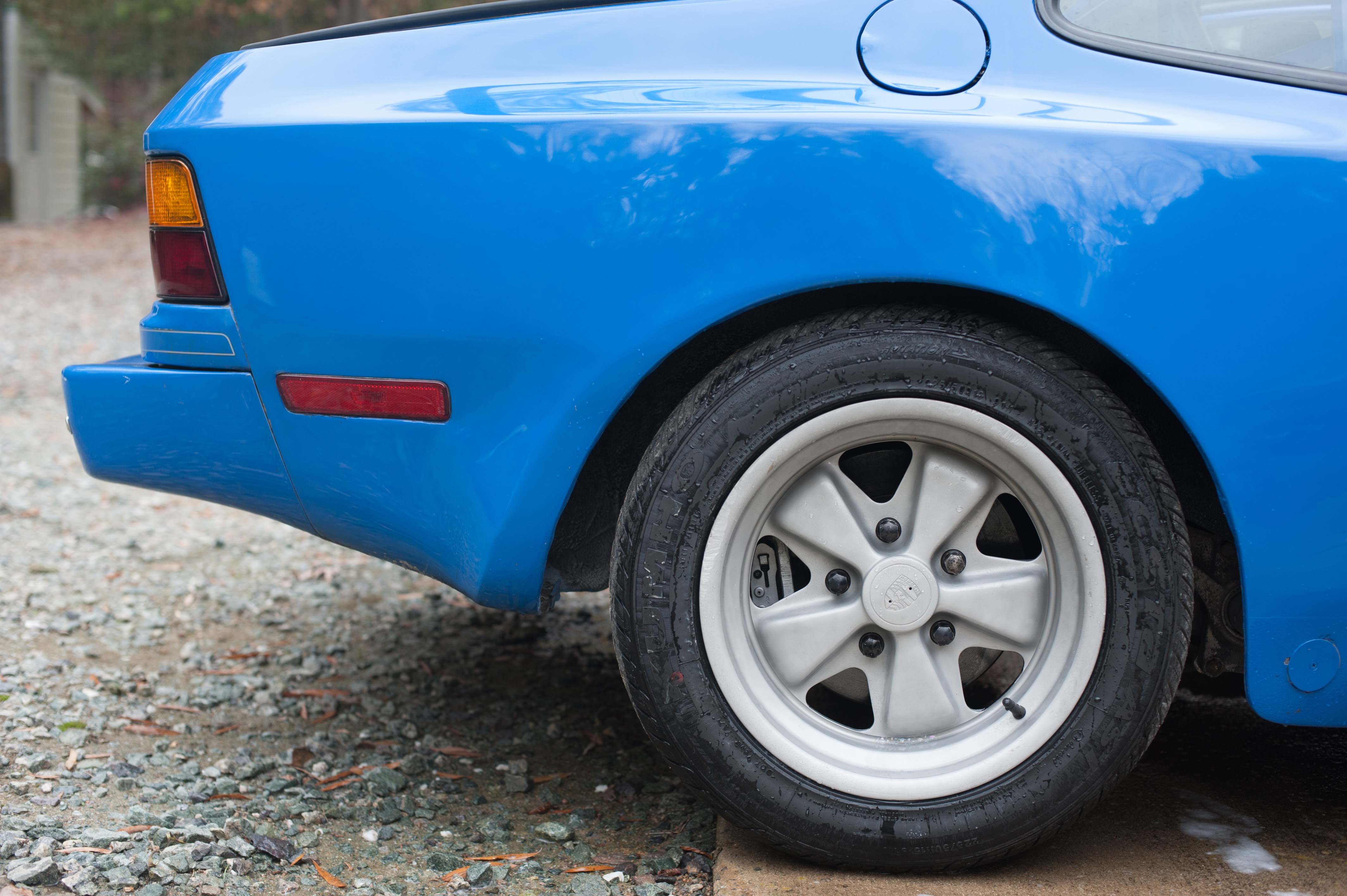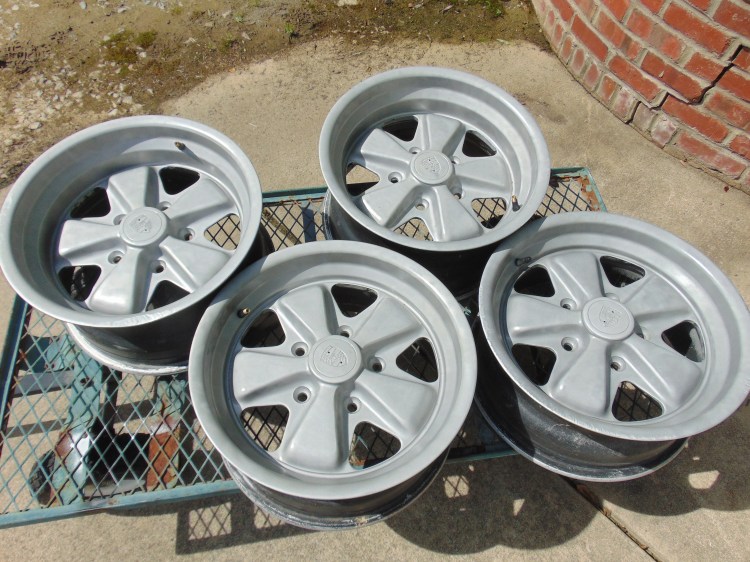 Regarding the wheels, they are to my knowledge the original Fuchs that came with the car. They are 15” diameter. The front wheels are 7” wide. The rear wheels are 8” wide. I get a little nervous about 30 year old wheels. So for safety and appearance sake, I bead blasted the exterior surface of the wheels and sealed them with Eastwood clearcoat. I think they look good against the blue color of the car and in this way, any cracks will be easier to see. I have inspected the wheels very closely. There is some curb rash but no cracks.