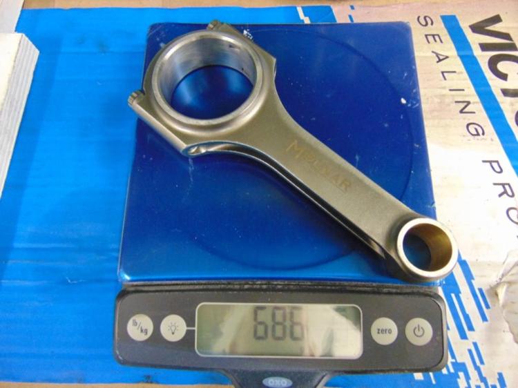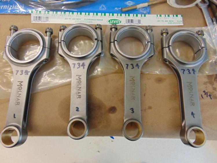 Although the original pistons and rods were perfectly serviceable, for this build I chose to go with new pistons and rods. There are 2 reasons. There is always a chance that the old parts may have hidden fatigue stress issues that will manifest themselves at the worst time i.e. at a track event. Also, for best power, new modern pistons, rings, and rods will provide the best performance. I decided to go with Wossner pistons and Molnar rods obtained from Racers Edge. Having steel liners in the aluminum bores, I had some concerns about what piston and ring product to use. After talking to Karl Potel at Racers Edge, he sent me in the direction of the Wossners. Just to be sure, I weighed the pistons and rods on a scale to make sure there were no significant differences in weight. I did not find any problems in this regard. The parts are beautiful!