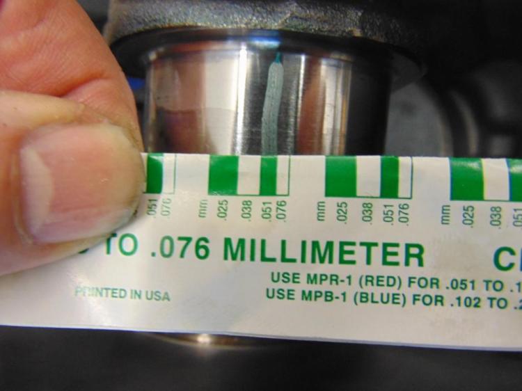 Now, we are ready to check the clearance on the rod bearings. In this case, I used Plastigage. Plastigage is an elegantly simple technique for checking clearances. It is basically a strip of plastic, formed to a precise, small diameter. You snip off a piece, lay it on the bearing journal, assembly the bearing cap, and apply a torque. You pre-select a diameter of Plastigage that is bigger than the anticipated bearing clearance. When the plastic is deformed by the bearing, it flattens out. How much it flattens out is indicative of the clearance. You compare your flattened piece to a guide printed directly on the packaging for the Plastigage and can get a fairly precise reading on the clearance. One side of the chart reads in inches. The other side in millimeters. Some tips: Clean the bearing surfaces where the Plastigage strip will be laid. Make sure your Plastigage strips are in good condition. Select the right size range. It comes in red, green, and blue depending on the gap to be measured. I used green for this job. You don’t need to apply full torque to the bearing caps. Just go to the first stage of torque, say 15 ft-lbs (the rest of the torque is used to stretch the bolts, it shouldn’t affect the clearance). You are mainly looking to see if your clearance is within the range shown in the shop manual. When you are done, you may want to re-apply assembly lube to the area you cleaned.