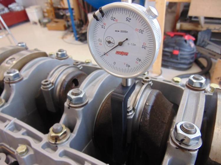Special fixture that allows rod cap bolting hardware stretch to be measured. Note that I use a Sharpie marker on each nut as it is torqued, as a positive verification that the correct torque has been applied. On fasteners external to the engine, I use yellow nail polish, which is somewhat commensurate to what the factory used.