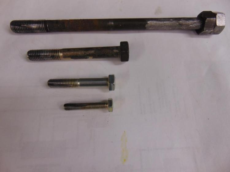 But first a word about prepping the block. As I noted in Part 1, I chose to clean the block in my blasting cabinet using glass beads. This allowed me to get the interior surfaces entirely clean. There is quite a bit of baked on oil residue in the interior of an engine and I felt it best to get it off. On the outside, I used the same approach but mainly for cosmetic purposes. As I noted, you have to be sure you get all the glass beads out. And it is safe to say, whatever approach you take, you will want to make sure you get the interior perfectly clean and free of any loose debris that could clog oil passageways or damage bearings. One other thing I recommend, while you have the block on the engine stand, is to clean out every tapped hole. If you don’t, you run the risk that whatever bolt or stud that goes into the tapped hole will not engage completely and/or any torque value you apply will be out of range because of the increased friction in the threads. For me, I clean the tapped holes with a combination of a thread chaser and brake clean. Similar solvents will also work. The tread chaser is simply a bolt or stud into which 1 or 2 grooves are cut into its length with a file or rotary cutting disk. The grooves give a place for the gunk to go as you gradually work the chaser in and out. Depending on how dirty the hole is, you may have to insert it a bit, remove it, spray the hole and the chaser with solvent, and repeat. I found that in particular the holes of the studs that attach the heads needed a lot of work. If you rotate the block on the engine stand so that the holes are facing downward, things go much better. Here is a picture of my thread chasers.