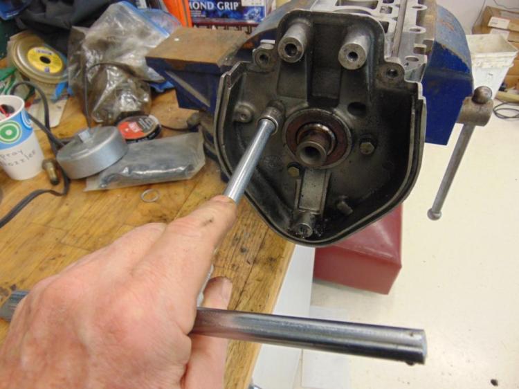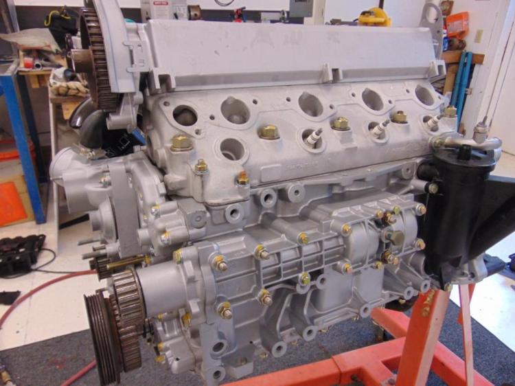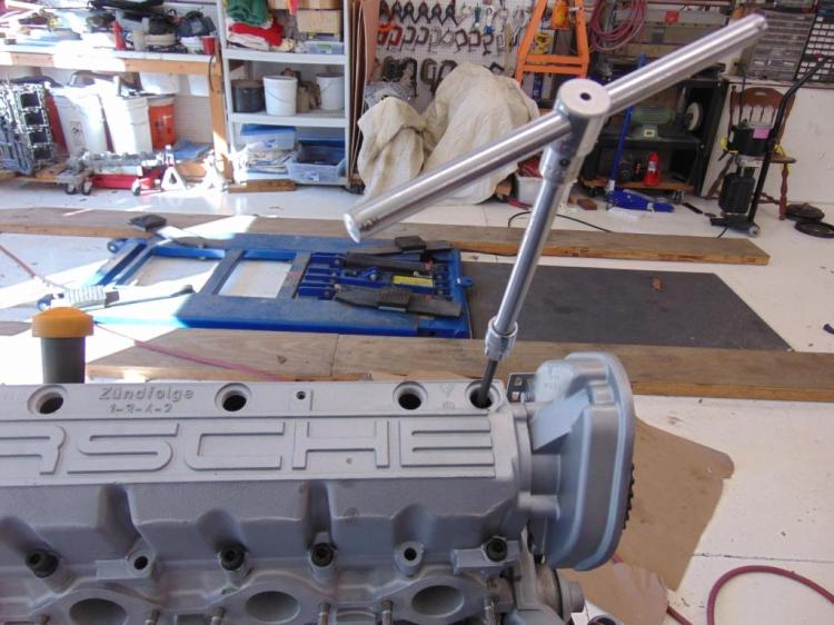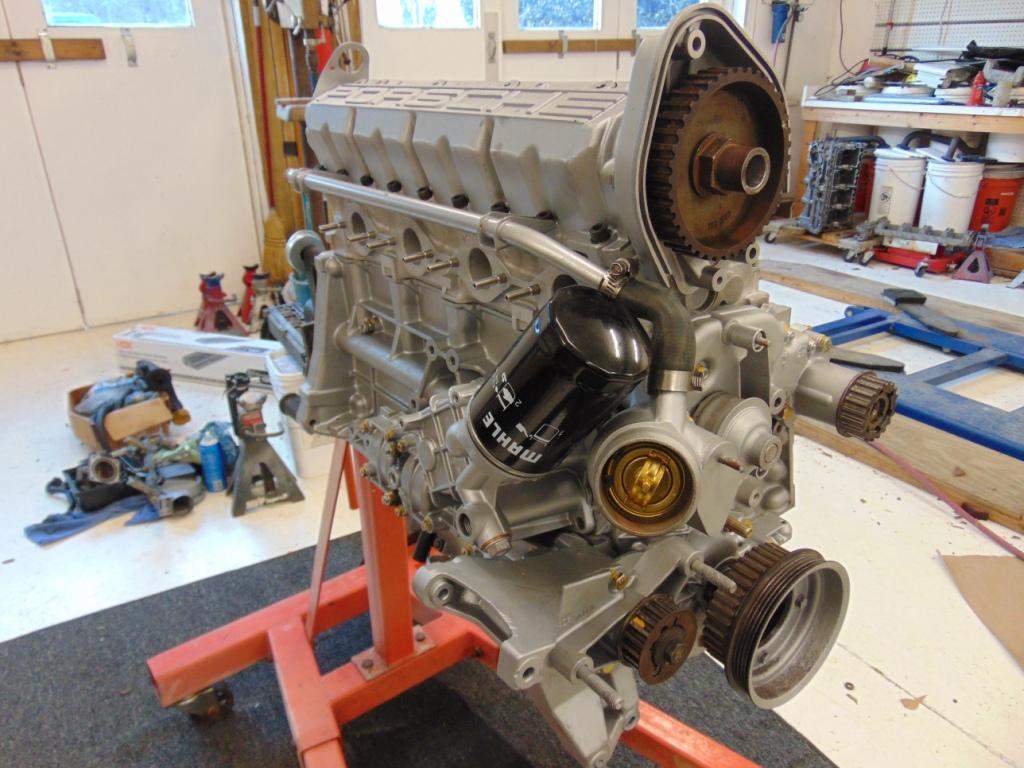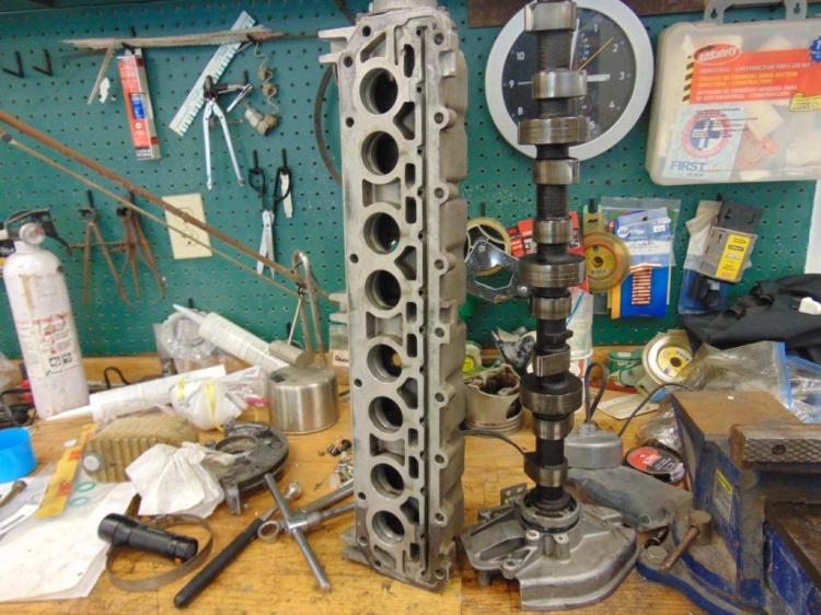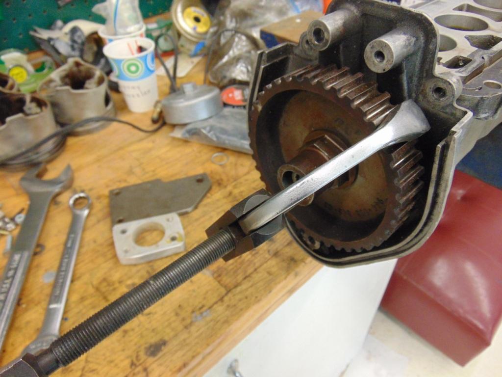 Assuming you removed the large triple point (also known as cheesehead) bolt at the front of the cam that holds on the cam belt drive gear, now is a good time to place the tower gently in a vice and torque this bolt to the value specified in the shop manual. You will apply counter torque with a suitable wrench applied to the wrench flats on the gear supplied for this purpose.