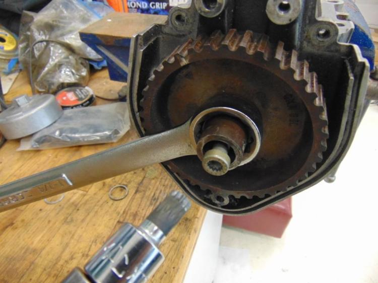 Hold the cam gear from turning with a wrench. This is the triple point bolt that needs to be removed. Having an impact wrench is a big plus!