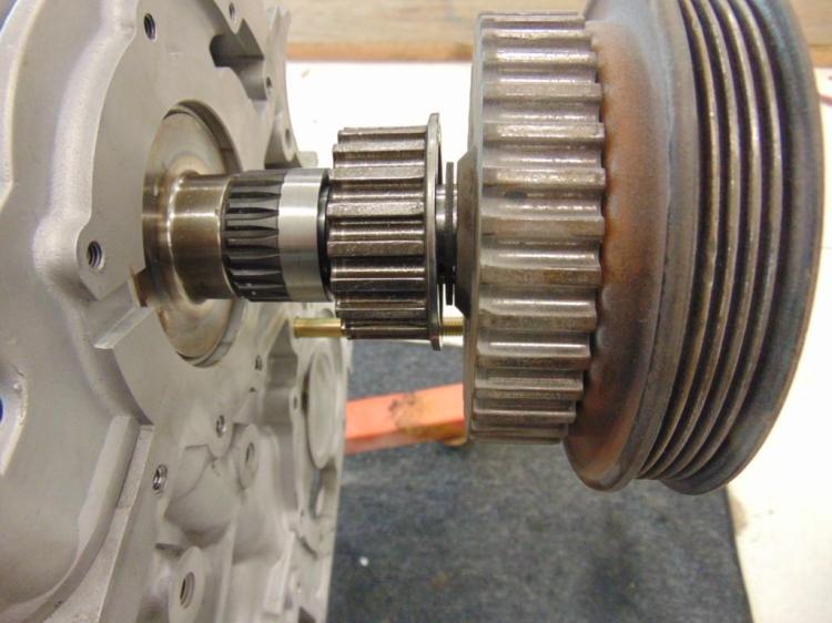 Order of assembly for the various pieces that go on the crankshaft snout. Note this shot was taken without the oil pump in position. The first item shown in the splined drive sleeve that will engage the internal gear of the oil pump.