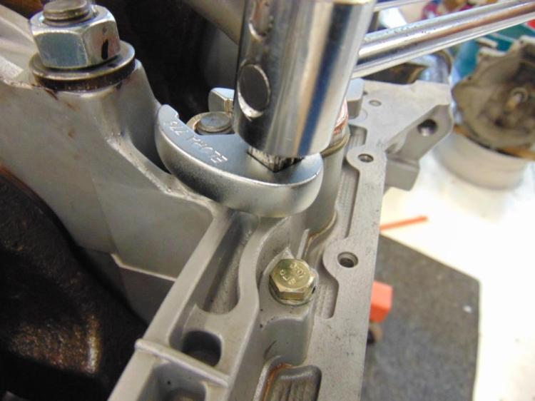 The other tricky issue is how to apply the proper torque to the single large nut that holds the pickup tube in place. To do it right, you will need a “crowsfoot”. See the picture below. By the way, the use of a crowsfoot does not affect the torque requirement of the nut in any way. Use the same value as you used for all the other similar nuts on the girdle, as specified by the shop manual. For the small screw that attaches the pickup tube and the return tube together, use Locktite to ensure this minor connection does not come apart.