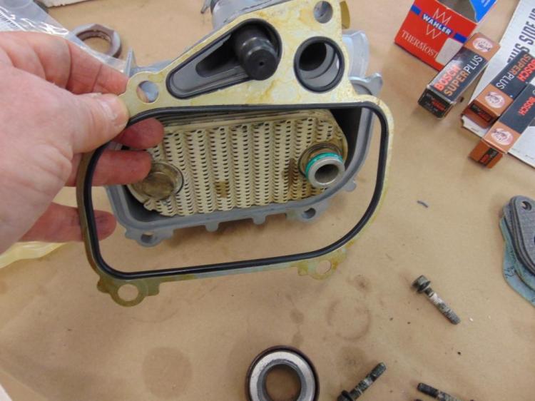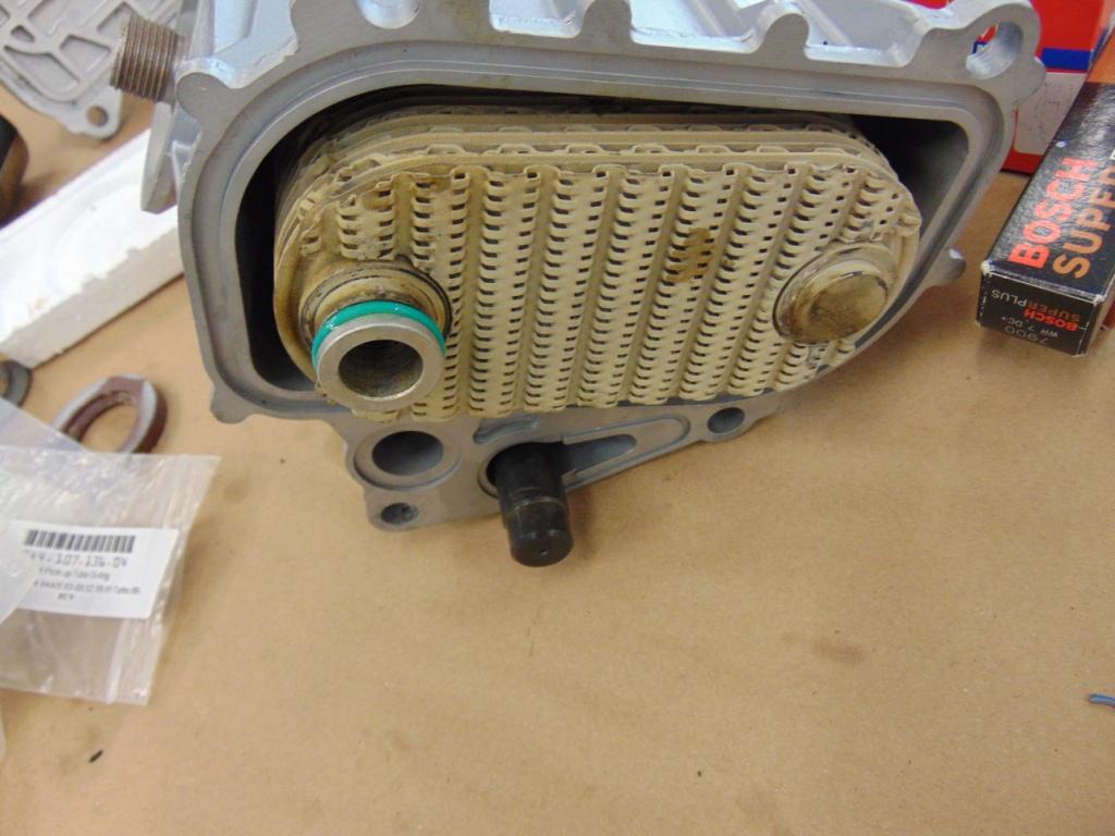 Next, you can install the oil cooler housing. Depending on your car, you will have the standard oil to water cooler or the one with an external oil cooler. You will also come across a range of oil pressure relief valve designs, which Porsche changed over the years. Make sure you clean the cooler housing as well as you can. It typically has an internal buildup of stuff that has precipitated out of the coolant. Money well spent is to replace the internal heat exchanger unit, both to ensure that heat transfer is back up to original standards and also to ensure that there are no metal shavings caught in the small passageways from previous bearing failures. Your gasket kit will come with new o-rings and the special gasket that fits between the housing and the block. No special sealants are required. The housing is held on with 4 bolts. Much has been written about getting the housing aligned perfectly so as to not have the oil pressure relief valve bind. I sucked it up and purchased the Porsche alignment tool to make sure everything was in line. I would recommend purchasing a new oil pressure sending unit to install.