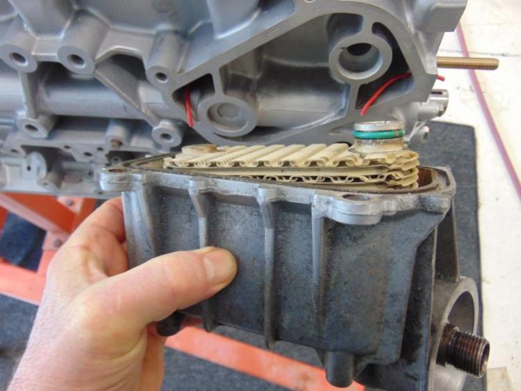 An example of an oil pan baffle where most of the tabs to hold the hollow void in place have failed.