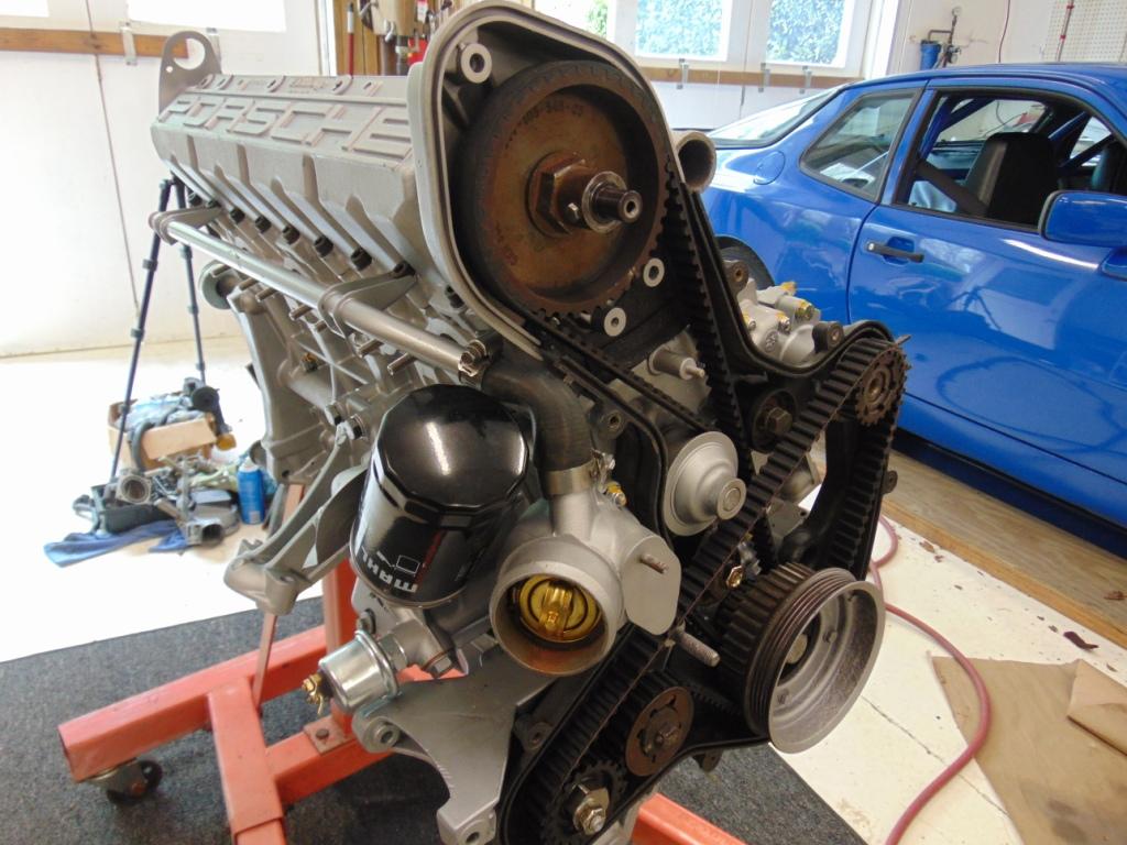 Next, let’s move on to the waterpump. If you haven’t changed out your waterpump in a while, it is probably a good idea to do so. One thing that I did on my engine was to put in helicoils and studs at all the waterpump fastener locations. This is not so much a strength issue as one of corrosion. I have had multiple cases where the waterpump screws would not fully torque without stripping their threads. I suspect coolant works its way down into the threads in the block and sets up galvanic corrosion, eating away the threads in the aluminum block material. Once you use helicoils and studs this will never happen again, or at least you won’t care since you will never have to dis-assemble these fasteners again! The waterpump comes with a paper gasket. It does not require any sealant. Torque the fasteners as specified in the workshop manual. For the same reason, I like to replace the screws with studs at the housing that is mounted on the top of the cylinder head, where the coolant outlet hose is attached. I cut the studs from bulk threaded rod material that I bought from McMaster-Carr.