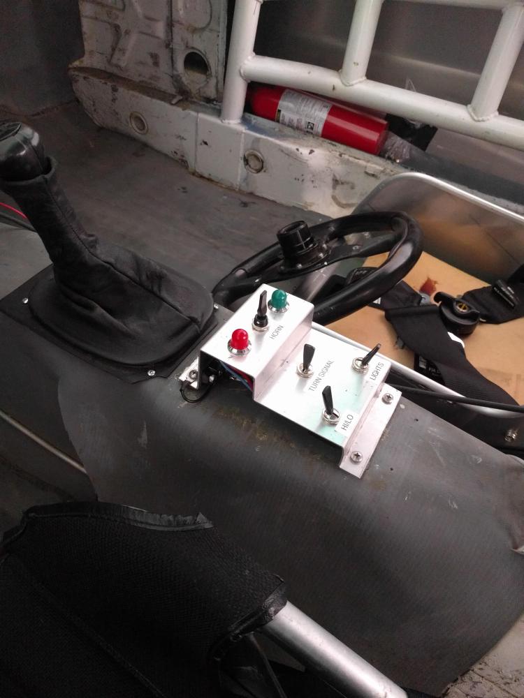 So the main items on the list that I had to add back to the car were headlights (hi and lo), parking/running lights, turn signals, brake lights, horn. This was all accomplished with the little console that I fabricated and wired up.