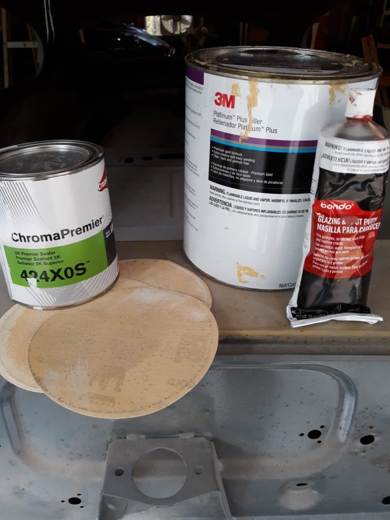 Per discussions with my painting consultant Rob at Finishmasters in Durham, NC we are going to sand down but not remove the existing paint finish. The paint is sound so there is no need to go “bare metal”, a phrase commonly used to indicate a start from scratch paint job. All of the rust issues were dealt with during the original restoration. No new rust issues have been identified. Most of the paint corrections involve scratches, dings, and cracks. So the approach is to sand the entire car with 400 grit paper to scuff the finish sufficiently to allow application of a “sealer”. Although I know from the first restoration the exact paint products used, a sealer is formulated to chemically isolate and stabilize the old paint finish in preparation for the new paint. In my case, we are applying ChromaPremier sealer. But first, the paint corrections are accomplished with a combination of traditional body filler and spot putty. I find the spot putty to be especially effective for small defects, where I can smash the putty into the defect with my finger and sand it smooth when it drys. Spot putty air drys so it is a slower process than filler, which is activated with a catalyst and hardens very quickly. But again, the spot putty seems to work the best for very small defects, which represents most of what I am dealing with. I have also done some more major work in the area at the rear of the car, basically the floor of the boot, which I admit received short shrift the first time around due to it’s being out of normal sight lines. Any areas where bare metal is exposed I hit with a rattle can of self-etching primer.