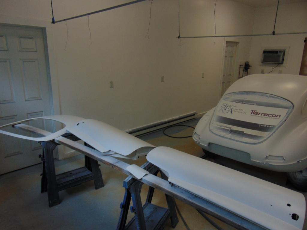 Once the body, doors, and deck lid are all repaired, they are sanded one final time with 400 grit paper and cleaned thoroughly with Final Kleen, which removes sanding sludge. A whole day was spent carefully masking off the car, which still has the interior in it, to keep the paint out from where I don’t want it. Finally, the relatively easy part is to spray everything with the sealer. So by the end of October, I have a car that in effect is fully covered in white sealer, ready for the next step, which is wet sanding with 600 grit and application of the basecoat and clearcoat.