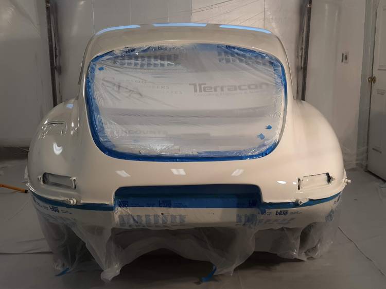 Next, I adjusted my process. In a perfect world, the basecoat is applied and 30 minutes later the clearcoat is applied. Typically 3 coats of basecoat and 3 coats of clearcoat and you are done. I tried that the first time. Unfortunately, there were multiple black specs in the paint job. So I changed my approached. I applied 3 coats of the white basecoat. After an hour or so, I inspected it closely with a good light. Any black specs were either sanded out or covered up with additional white paint. Once I had a perfect coat of white basecoat, I then applied the clearcoat. I typically did find black specs in the clearcoat but the advantage is that the clearcoat can be sanded and in most cases the debris will be sanded out. Of course there is always a catch. If the debris is very deep in the clearcoat, you will sand through it to the basecoat. The repair for this situation requires that the sanded through area have more white applied over it locally and then the clearcoat must be applied over the entire panel. As a consequence, both the body and the bonnet wound up with multiple coats of clearcoat.