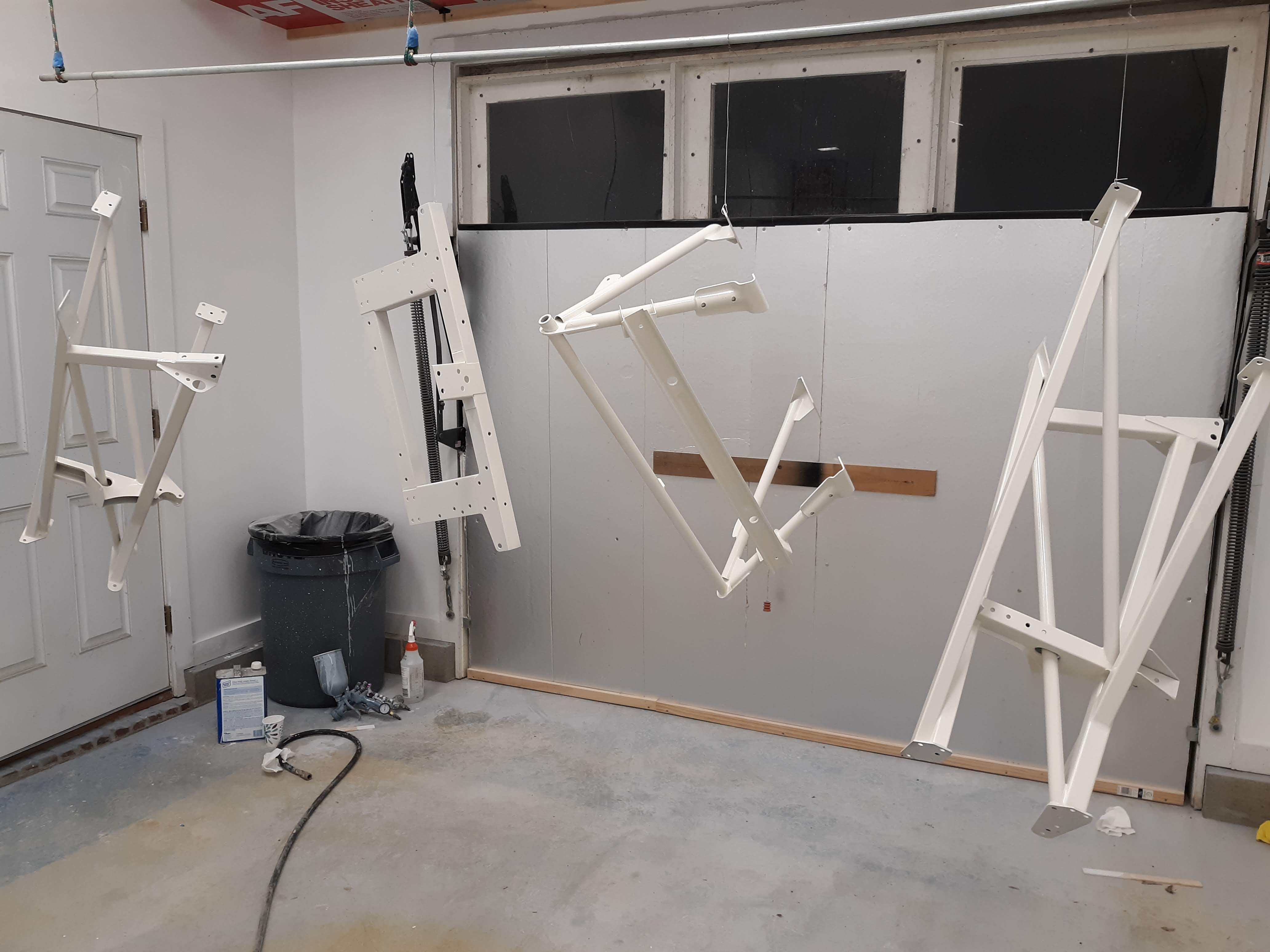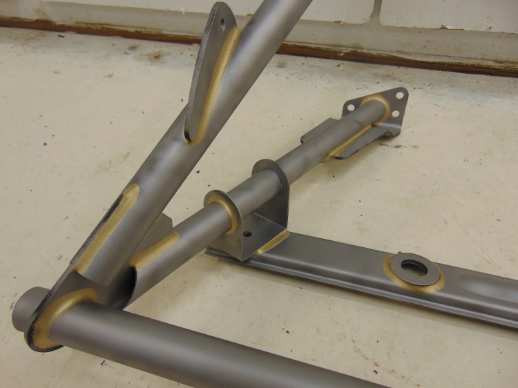 Engine Frames – one of the first things I wanted to do after painting was to attach the engine frames to the firewall. I haven’t talked much about the engine frames. If you were to refer back to the article here, you would see that the engine frames that were on the car when I got it had some pin hole corrosion on the bottom surface of the lowest frame members i.e. where all the water settles out to. I made a repair using brazed plates. After almost 10 years of use, this repair seems to be holding up fine. But upon inspection I identified a cracked weld at one of the joints. This is a bigger deal. Fortunately, a few years ago I purchased a set of aftermarket frames manufactured by E Type Fabs in the UK. I decided it was time to put them into service. I bead blasted them back to bare metal to allow a close inspection for condition and to start the painting process. The brazing work on these frames is beautiful. It’s a shame to have to paint them.