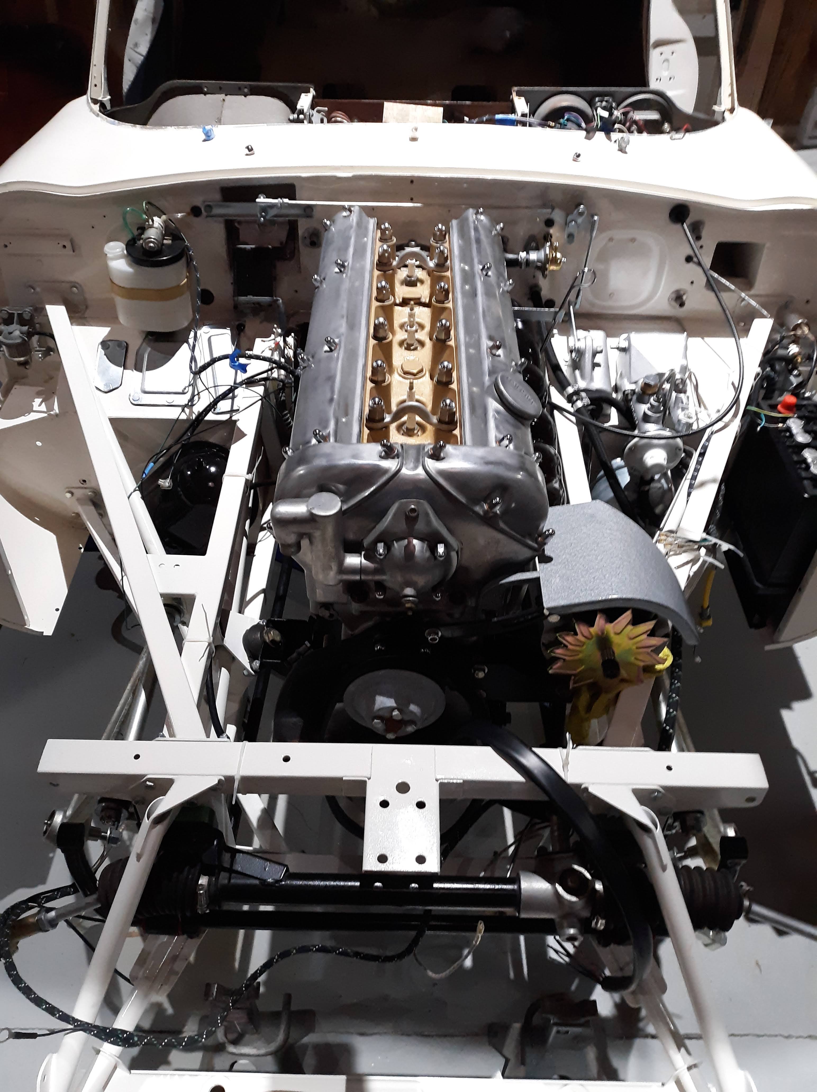 The bolting hardware required to fit the two engine frames, the picture frame, and the bonnet support frame is a little bit of a puzzle. Fortunately there is a very nice document available that lists the size and location of the various bolting. Link. Concours originality would require that all the bolting hardware be a specific type such as BEEs or GKN. For this build, I have defaulted to modern Grade 5 hardware obtained from http://www.mcmaster.com. They sell the bolts in clear zinc so they match all the parts in the engine compartment that I had plated in clear zinc. I used “co-loc” nuts, which have a nylon insert that resists loosening due to vibration. Almost all of the holes on the frames had to been cleaned out with a drill bit to remove enough paint to allow the bolts to be inserted. The fitment on the E Type Fabs frames was pretty good. I had to use a bar clamp at the front to squeeze the 2 sides together a bit to allow everything to line up. I fitted the frames before the engine was installed. In retrospect, I suspect that one could at least “stage” the engine in place on a dolly or such and avoid some minor drama as I encountered when I put the engine in place after the fact.
