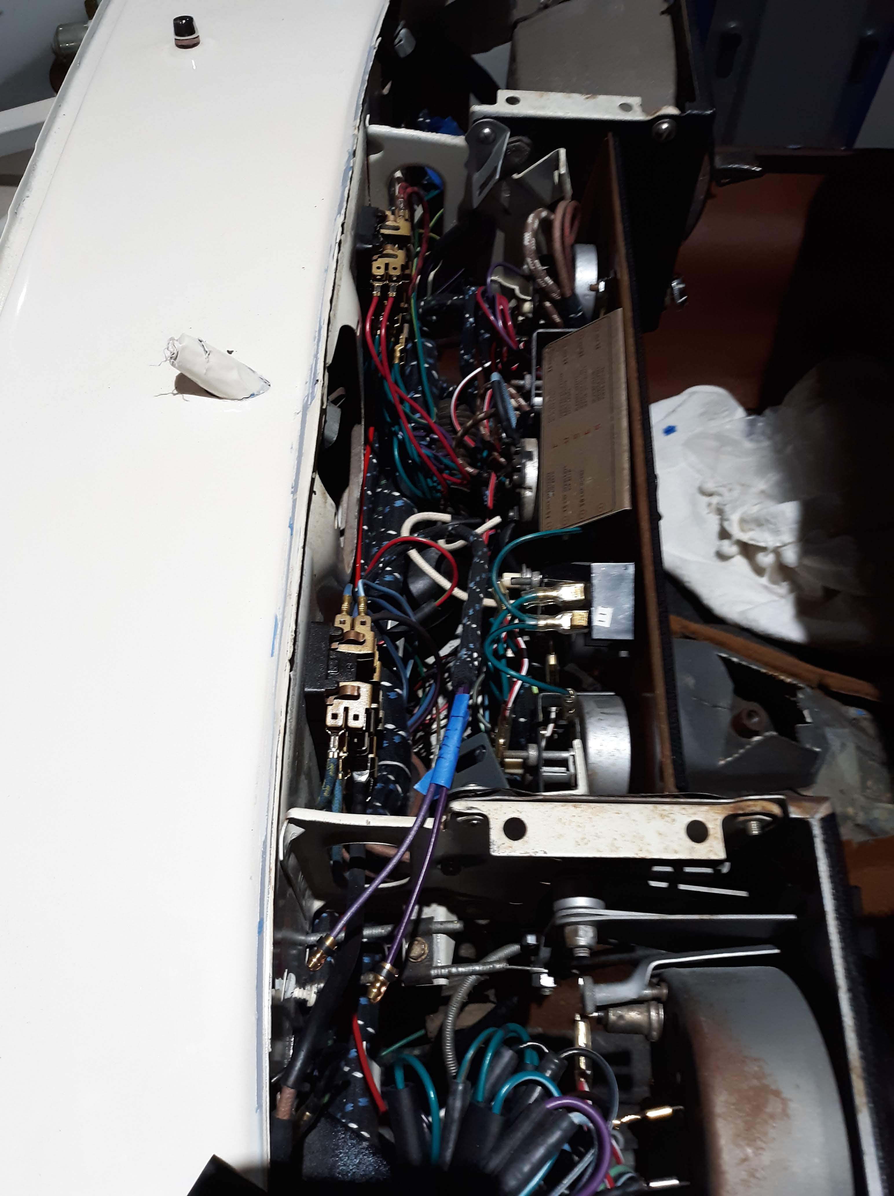 There are 2 major harnesses in the dash. Both exit into the engine compartment from behind the voltage regulator. Other harnesses connect as required to feed the rear lights, fuel pump, fuel tank level sender, interior lights, etc. At this point, all the harnesses that reside inside the cockpit are installed and the ones that lead into the engine compartment are also installed but not routed yet. I am very impressed and pleased with the workmanship of the Rhode Island Wiring harnesses.
