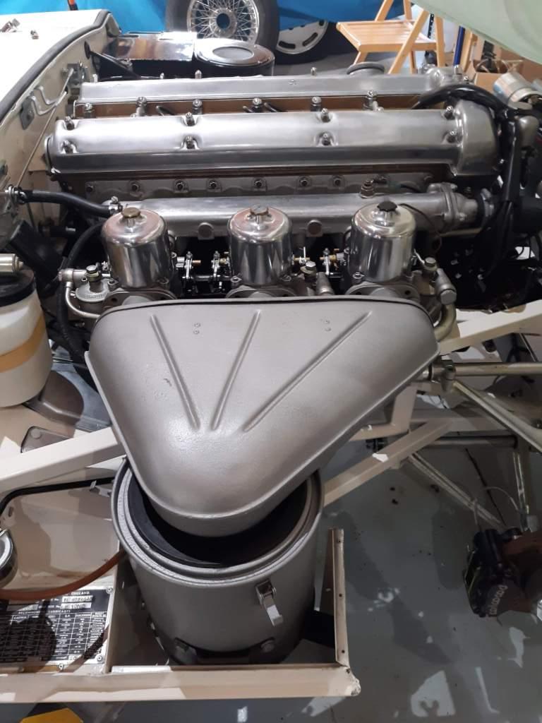 I pulled my stock air cleaner parts down off the shelf. They were pretty sad looking next to all the shiny bits in the engine compartment so I cleaned them and gave them a new coat of the correct silver hammertone paint. When doing final tuning on this engine, you want the air filters to be in place, as the minor restriction to air flow that they have is important to be there when you are setting the mixture. As an aside, when I bought my blue Etype years ago, the previous owner had ditched the stock air filters and put little foam pancake filters directly onto the carb inlets. I’m sure they throught they were making a performance mod. Unforunately, they did not revise the carb needles to suit and the car did not run well at higher rpms. After going to a “richer” needle to match the increased airflow, I had the car running like a champ. So keep in mind, increasing just air flow or just fuel flow is not good, they have to be coordinated.