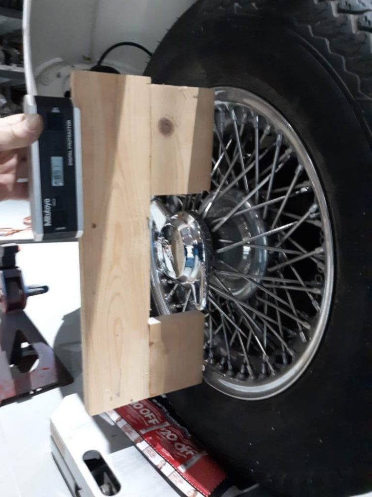 Now that I had all the major weight items installed on the car, it was time to check ride height. I had set the ride height using the “setting link” process from the Bentley shop manual, which basically involves installing the torsion bars into the lower A arms to achieve a precise dimension between the upper and lower shock mounting bolts. Then you cross your fingers and pray! That setting was made many months ago when I was reassembling the front end of the car. Now for the moment of truth. I was amazed to find that, measuring from the door sill to the garage floor, the car was basically level. Wow, that was a relief because messing with the torsion bars is no picnic. With no need to further mess with the torsion bars, I proceeded to tighten the lower and upper balljoints and the steering tie-rod. And just a few days ago, I checked and fine tuned the castor, camber, and toe-in.