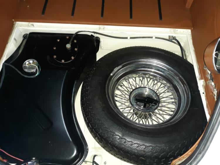 I’m getting closer to being done but oh that last 10% is so hard to complete. Here are some things that have been completed since my last update. I decided to get the engine running and things completed in the engine compartment as much as possible. When I added a small amount of fuel to the gas tank, I had a strong odor. Unfortunately fuel was leaking out of the bottom of the tank from somewhere. After replacing the sump gasket, there was still a leak. This was the original 50 year old tank so I decided to get a new one. SNG sells a nice package with a new tank, fuel sender, sump, filler neck hose, and assorted gaskets and hardware. From here forward, I’m never going to screw with old fuel tanks when a new one can be had for less than $600. Anyway, the biggest drama of removing the tank, which I resolved after some internet sleuthing, is that you need to remove the support bracket at the right/forward corner of the tank. The nuts can be accessed, barely, from the bottom of the car in the IRS tunnel area. Once that bracket is gone and you’ve sawed through the old filler neck hose, the tank will come out but the fit is very tight. With the tank out, the area under it got a good cleaning from 50 years of filth. Then the new tank was put in and hooked up. It’s a tough job but not as bad as I anticipated. And yes, the old tank had terminal corrosion in its bottom, which was the cause of the leak. The fuel tank on an Etype resides inside the interior of the car. Not the greatest design feature. If there is any hint of a leak or loose fitting, the occupants get to smell the gas fumes. But all is good now.