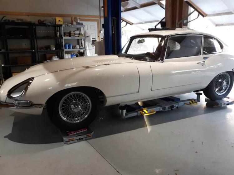 The car had been on my single post lift for months. There were no seats and no doors installed. The lift blocks off access to one side of the car, in my case the passenger side. I installed the drivers seat and drivers door. Getting the door lined up and closing properly is not a trivial task. In general, one half of the hinge allows the door to be rotated slightly up and down at the back edge when the door is closed. The other side of the hinge allows the door to be rotated up and down with the door wide open. And both hinges halves, which are attached with 4 bolts each, allow a modicum of straight movement up/down and left/right. As such, you have a lot of potential adjustments that can help resolve fitment issues. Also, the chrome window frame can be adjusted slightly. It is pretty hard to describe in words but with work, you can eventually get a decent fit. The next problem is that brand new rubbers, which are generally a good idea, can be stiff and keep the door from shutting nicely. When I look at the 50 year old door rubbers on my unrestored Etype, they are quite squashed in places. So there is a period of time with new rubbers that the door closure is just going to be stiff. I’ve got it looking pretty good but its not perfect. I also took the opportunity to put in new door closure check straps. Once I got the drivers side done, I lowered the car off the lift, pulled the lift back, and did the same on the passenger side.