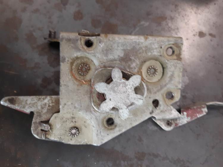 After painting, new glass, re-chrome of the frames, and new gaskets, it was time to hang the driver and passenger side door. I discussed some aspects of the hanging the doors here. But recently, it became apparant that I was not going to be able to get the doors to latch properly with a reasonable closure force. One thing I discovered is slop in the door latch mechanism. We are talking about the mechanism that is mounted to the door.