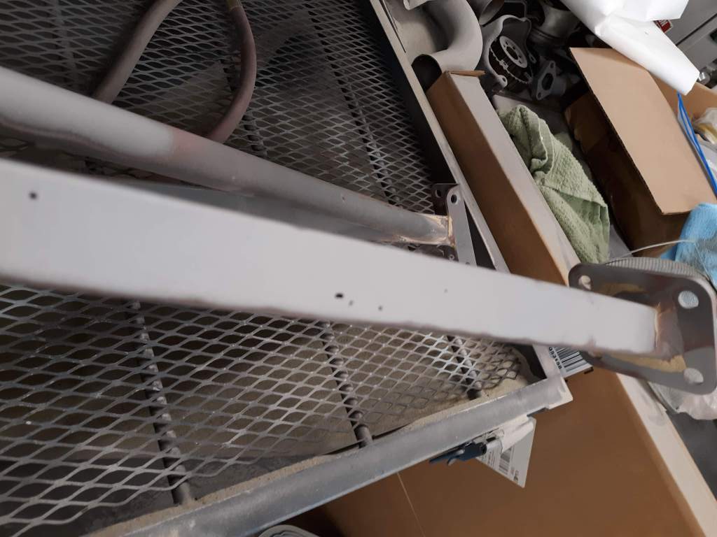 So while thinking about the replacement of these pieces, it occured to me that the “engine frames” attach to the sill closing plate, which has substantial captive nut plates in behind it. And if I wound up having to cut out and replace the captive nut plates, it would be necessary to temporarily mount the engine frames so as to position the nut plates correctly. This and the fact that 60 year old engine frames are not always in the best of shape led me to go up to the attic and retrieve my left and right engine frames. At some point, someone had painted them up nicely with heavy grey primer. This had to come off in order to evaluate the frames. So into my bead blast cabinet they went, one at a time. I started by bead blasting the welds on the drivers side frame. No issues noticed. Then I started to remove the paint on the tubes themselves. And found this.