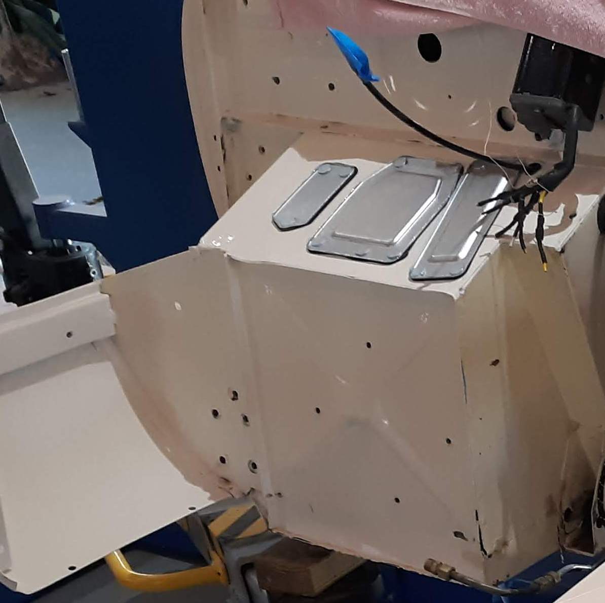 At a previous time, someone had replaced the footwells, the bulkhead panel, and the sill closing panel with plain sheetmetal parts. They did a nice job from a structural standpoint but the way they did the fabrication is in no way as the car was originally built. So part of my restoration plan now includes cutting out these pieces and replacing them with factory correct parts. The black footwell panel in the photo above is one that I have already obtained from SNG Barrett. Not shown but I have also obtained the bulkhead and sill closing plates from SNG.