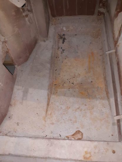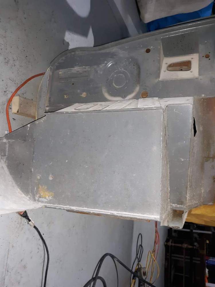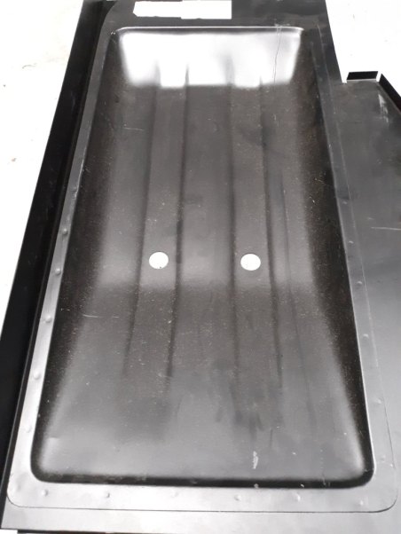 So here is the passenger side footwell. No, that’s not rust, just some debris. Actually the footwells are nice and smooth. Too smooth. Below is a authentic replacement footwell. Notice the “troughs” for lack of a better word pressed into the sheetmetal. Not to mention the 2 drain holes.