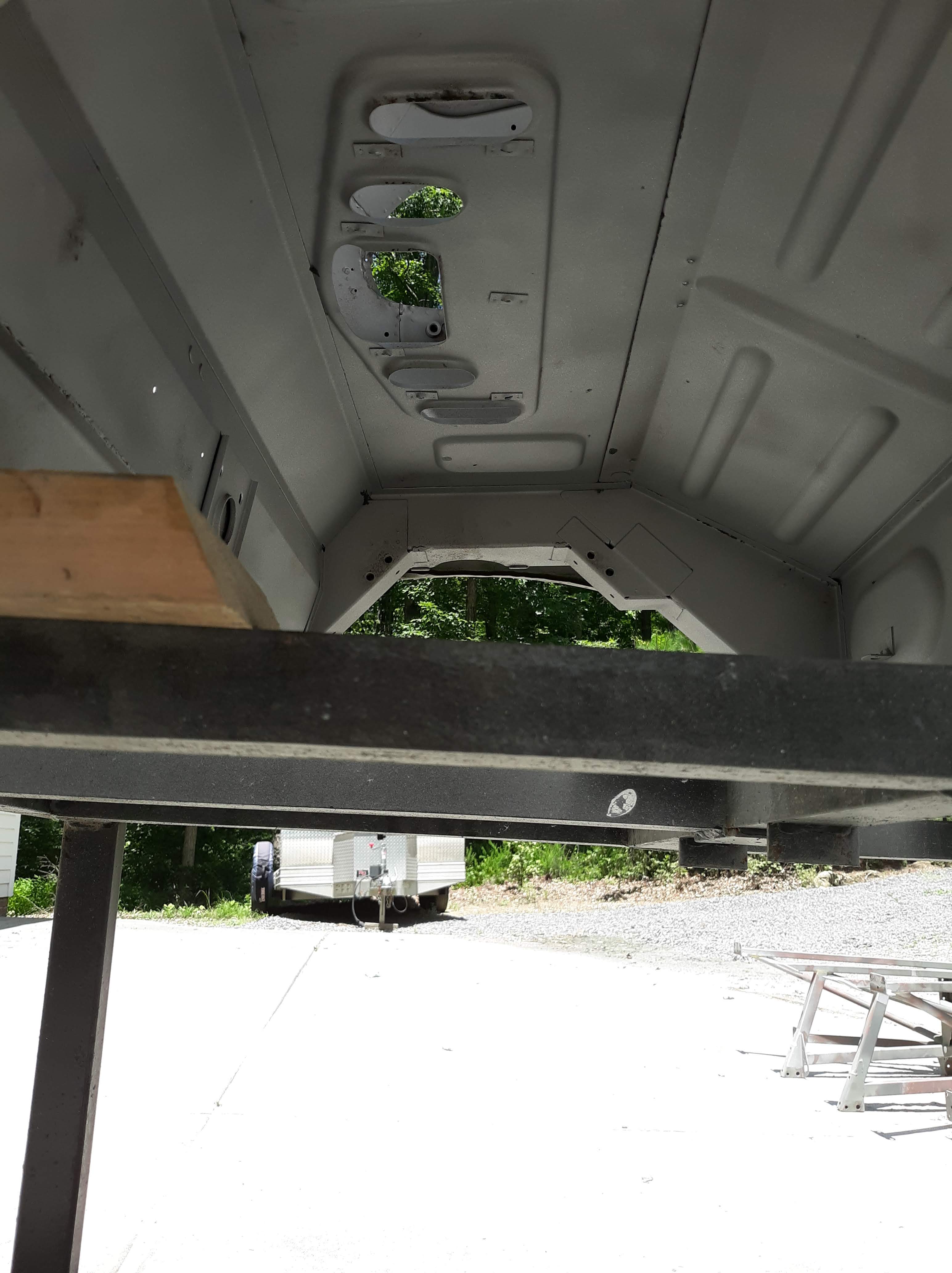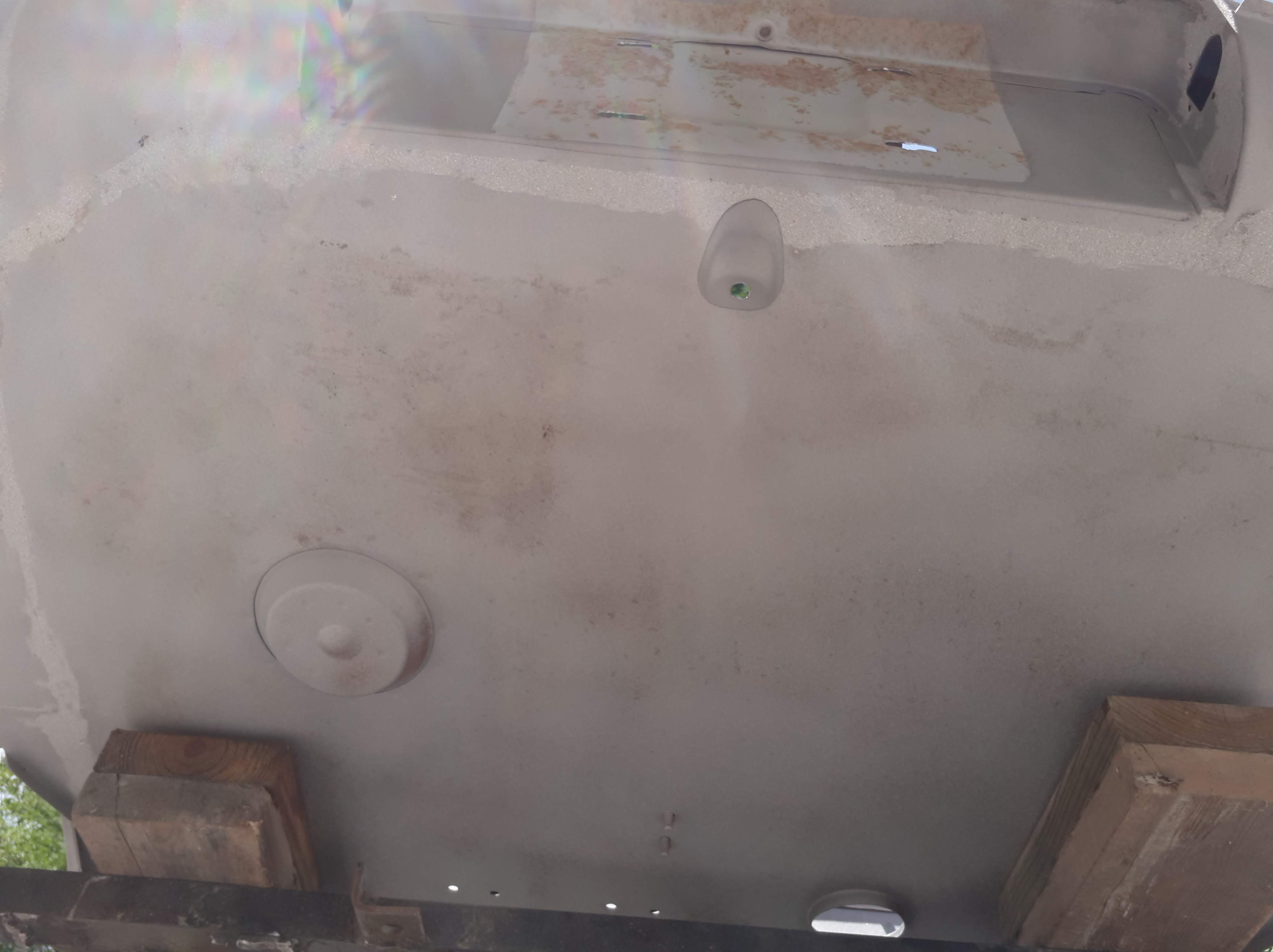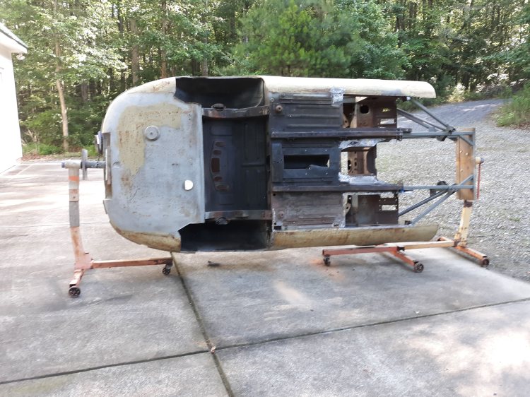 The really really good news is that we found no rust or corrosion. Nada. Man, what a relief. I had been pretty confident but you never know what you will find under the paint or undercoating. The blasting of course removes the paint down to bare metal. It also removes plastic body filler, and traditional tar type undercoating. It roughens up but doesn not remove lead used at the body seams. You will see some black in the photos, which is generally seam sealer. They were able to get a lot of the seam sealer but I had them leave any that was really stubborn. It’s designed to be painted so not a problem going forward. We did most of the work on the rotiserrie. When the body shell was done, I transferred it to my shop cart and took off the rotiserrie attachments, allowing them to come back and blast where the rotiserrie had been attached. After they left I spent some time with my leaf blower getting sand out of the car but I am sure once I get it back on the rotiserrie more will fall out of the cavities as the body is rotated. They used twelve 50 pound bags of sand. It is now deposited on the concrete apron in front of my shop but is not objectional, at least to me. I thought I would joke with the guy doing the blasting that he probably never dreams about going to the beach on vacation but I figured he’d heard that line too many times.