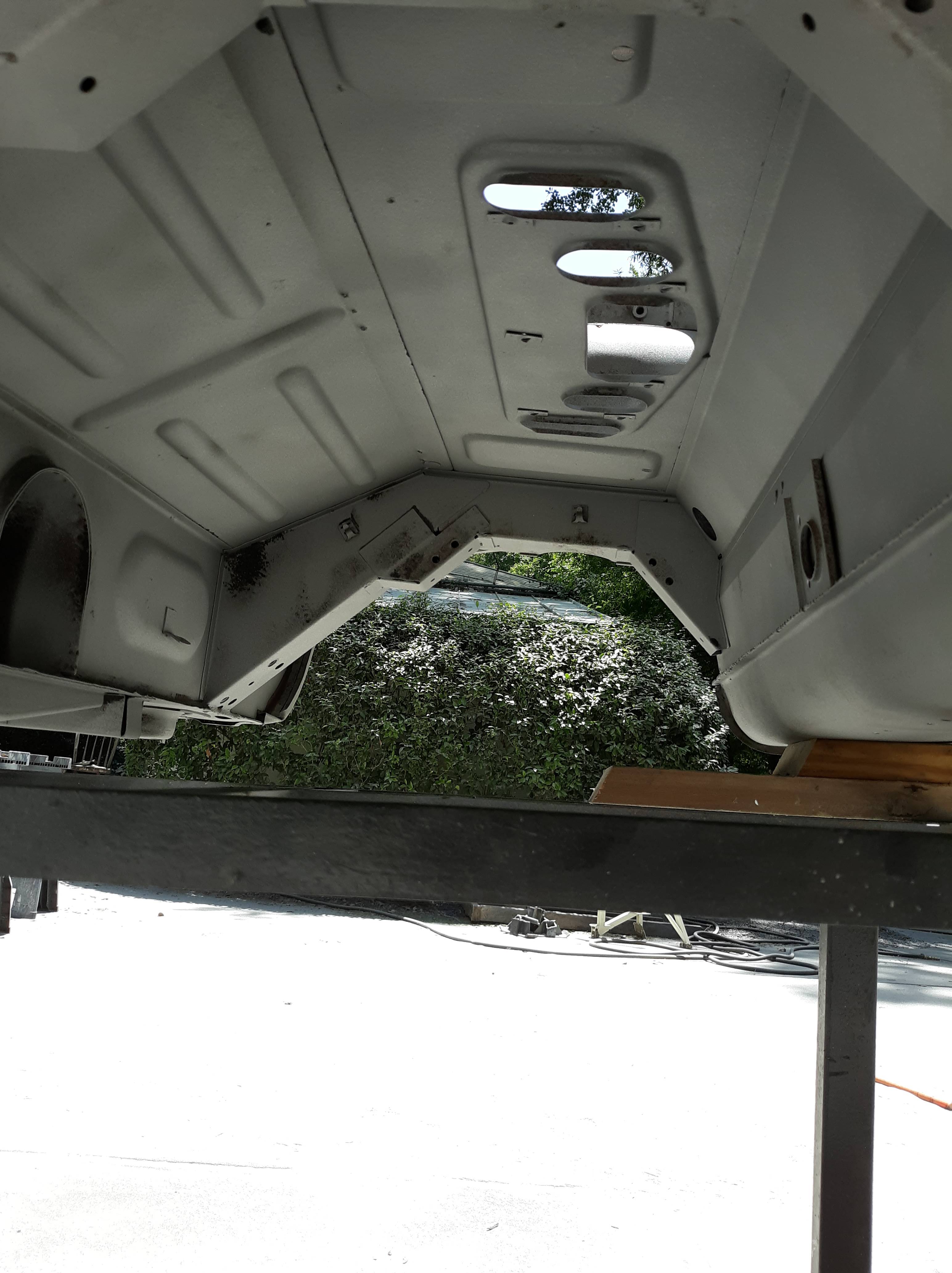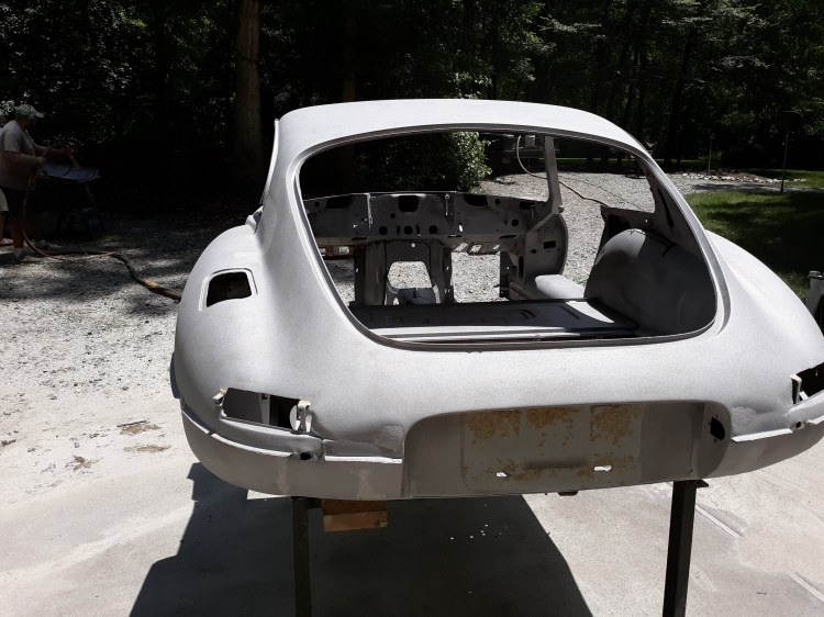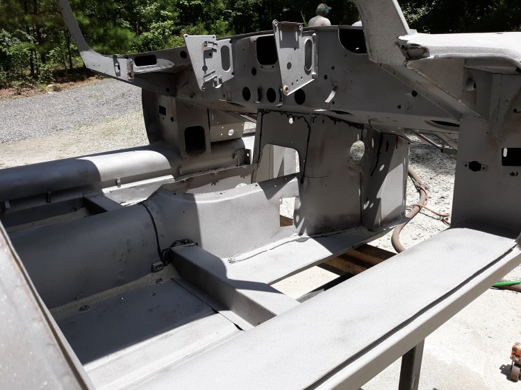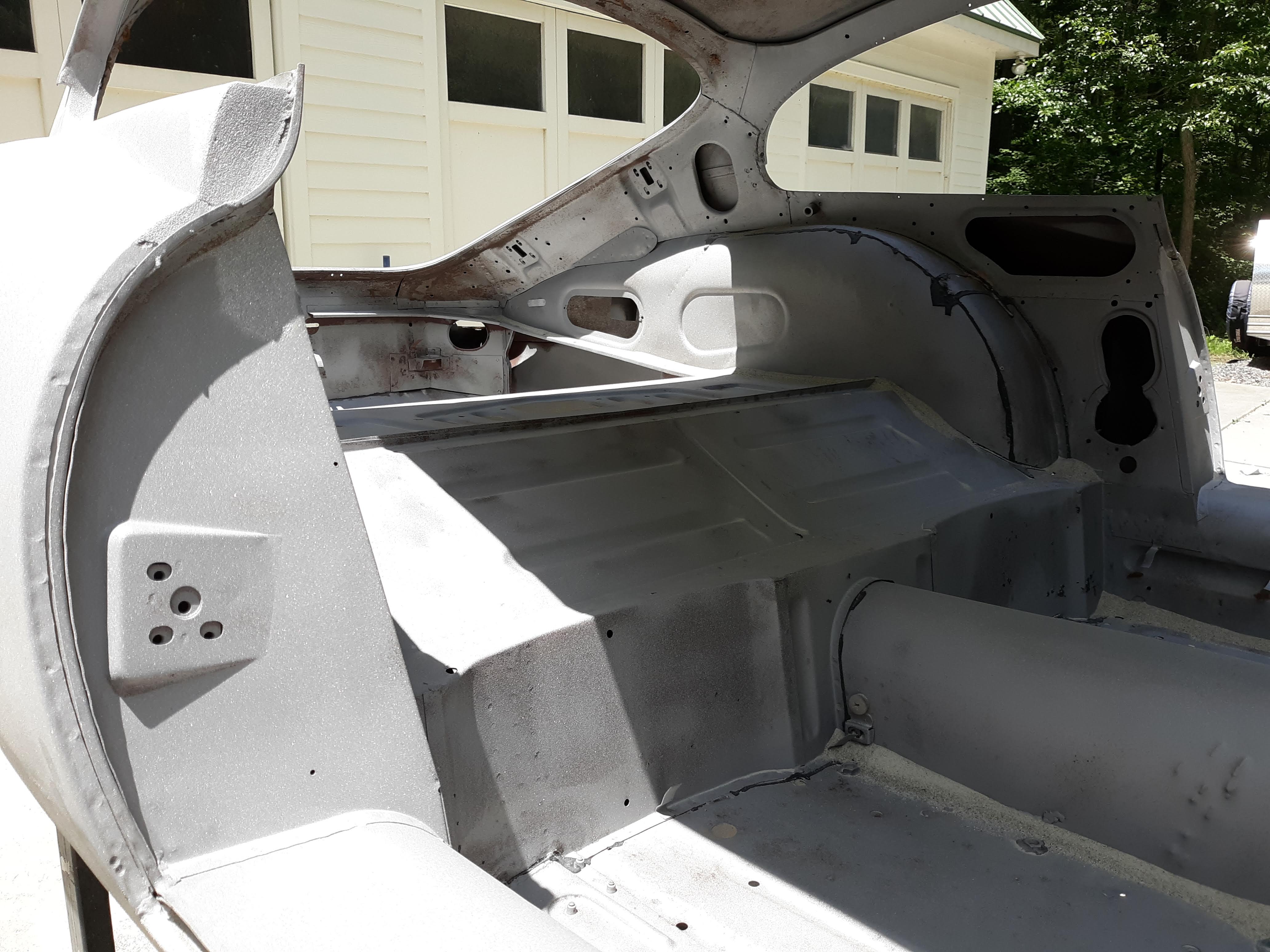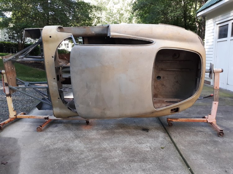 I didn’t want to put myself through that again, especially in the middle of the summer. O’Tooles showed up and 6 hours later they had blasted the body shell (inside and out), the bonnet lower section, the bonnet wings, and the deck lid (I’m getting a new bonnet center section). For well under $2000. Well worth it, in my opinion.