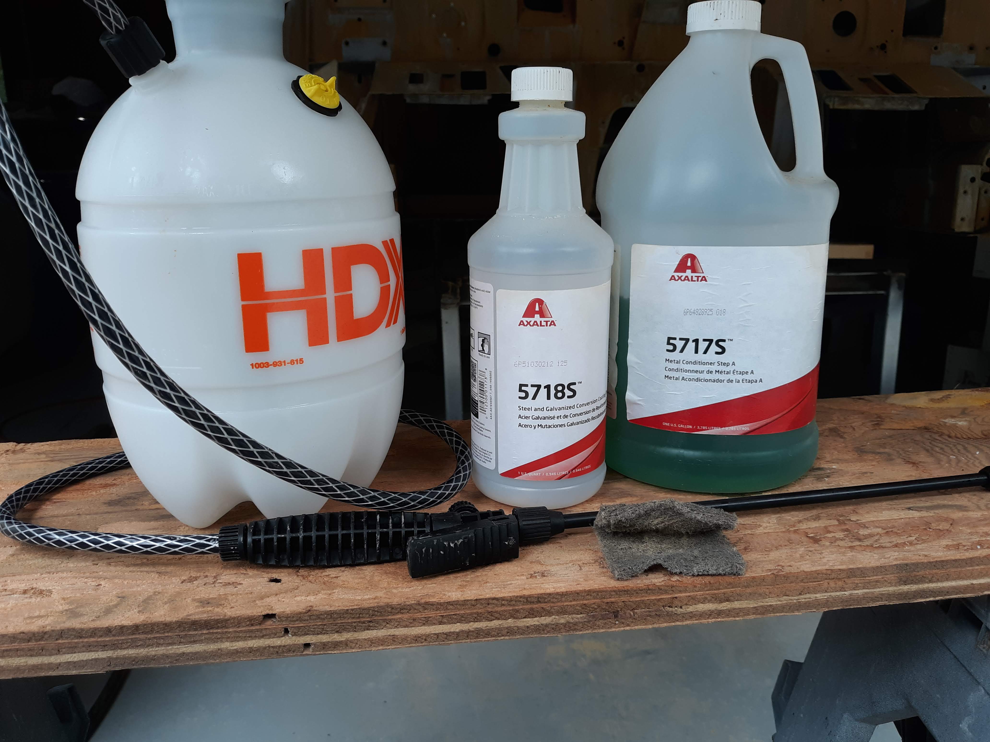 My dilema as a solo guy painting a car is meeting the Recoat requirements. Sanding in itself is not a problem and is inevitable for the exterior of the car. But what about the interior and the underside. Unlike the exterior, the interior and underside represent a maze of convoluted surfaces, not at all easy to sand. One solution is to be prepared to shoot your primer, sealer, basecoat, and clearcoat all in one session, within a short time of the car being media blasted. Not going to happen for poor pitiful me. I posed this dilema to my Axalta Tech Rep and he came back with a solution I can live with. He said apply 2 products to the bare blasted metal first. Then I could wait to do the rest. In the Axalta world of products, he suggested 5717S and 5718S.