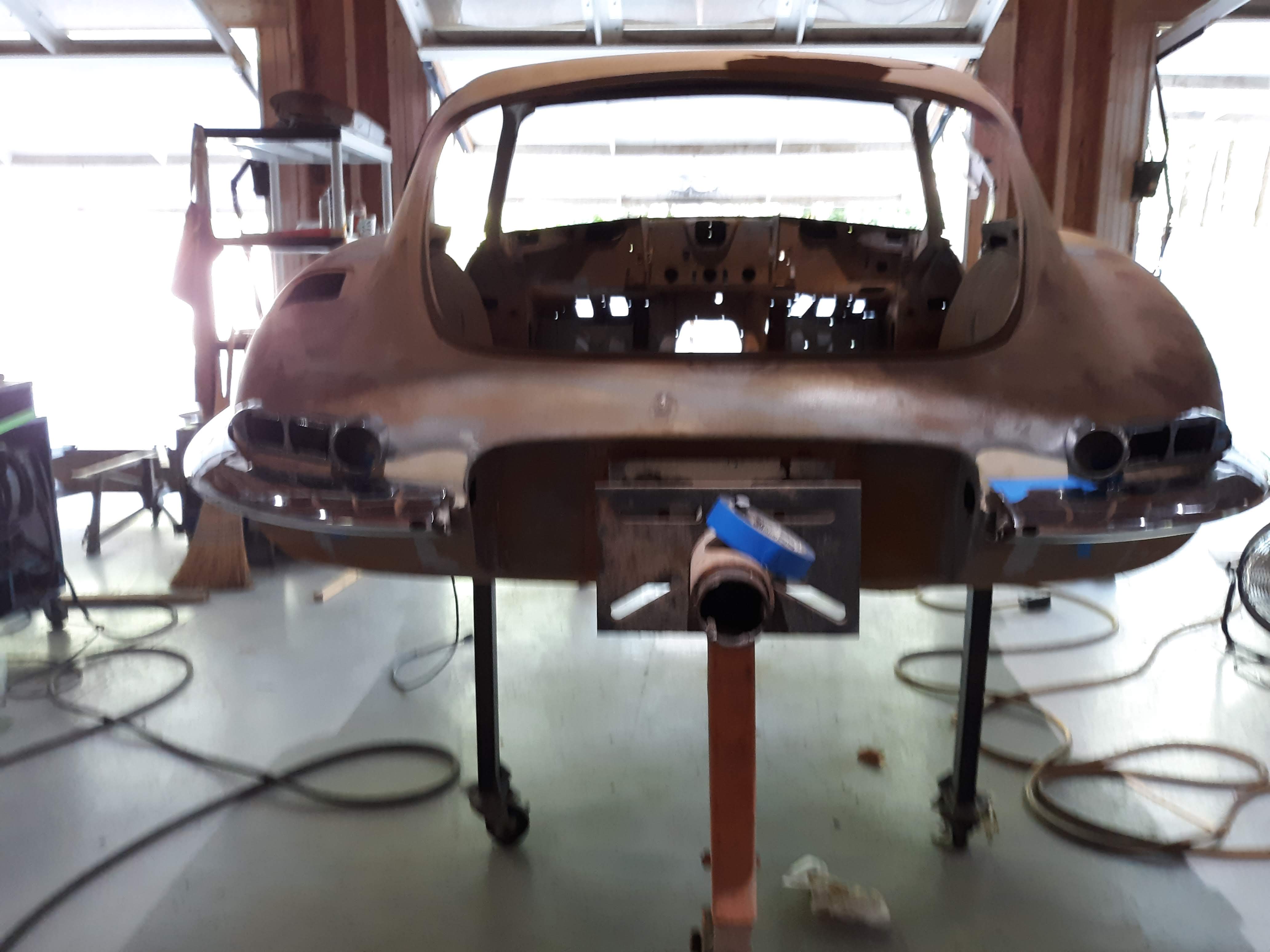 First the roadblock. Procuring paint. The Heritage Certificate for my car indicated the car was originally painted in Opalescent Golden Sand. After a little research I determined that BASF/Glasurit still maintains the original RM paint code. I obtained a small sample, sprayed it out, found it to be a good color, and decided to commit to the full line of Glasurit paint products, from primer to clearcoat. Many will say that Glasurit is one of the finest automotive paints made. Most will say it is the most expensive! I guess it should come as no surprise that even here in the capital of NC, Glaurit isn’t a standard item for the paint suppliers. I am now in my 3rd week of negotiations with the local paint rep and the regional Glasurit rep to make sure that I am ordering the correct products. Some have to be special ordered. The current promise is that my paint will be ready next week. So in the meantime, I’m trying to get everything done on the inside and bottom of the body shell, which will get painted wet on wet i.e. I will spray the primer, basecoat, and clear all in one session. No sanding. So in preparation, I’ve been studying and fixing the body shell to make sure it is ready to go.