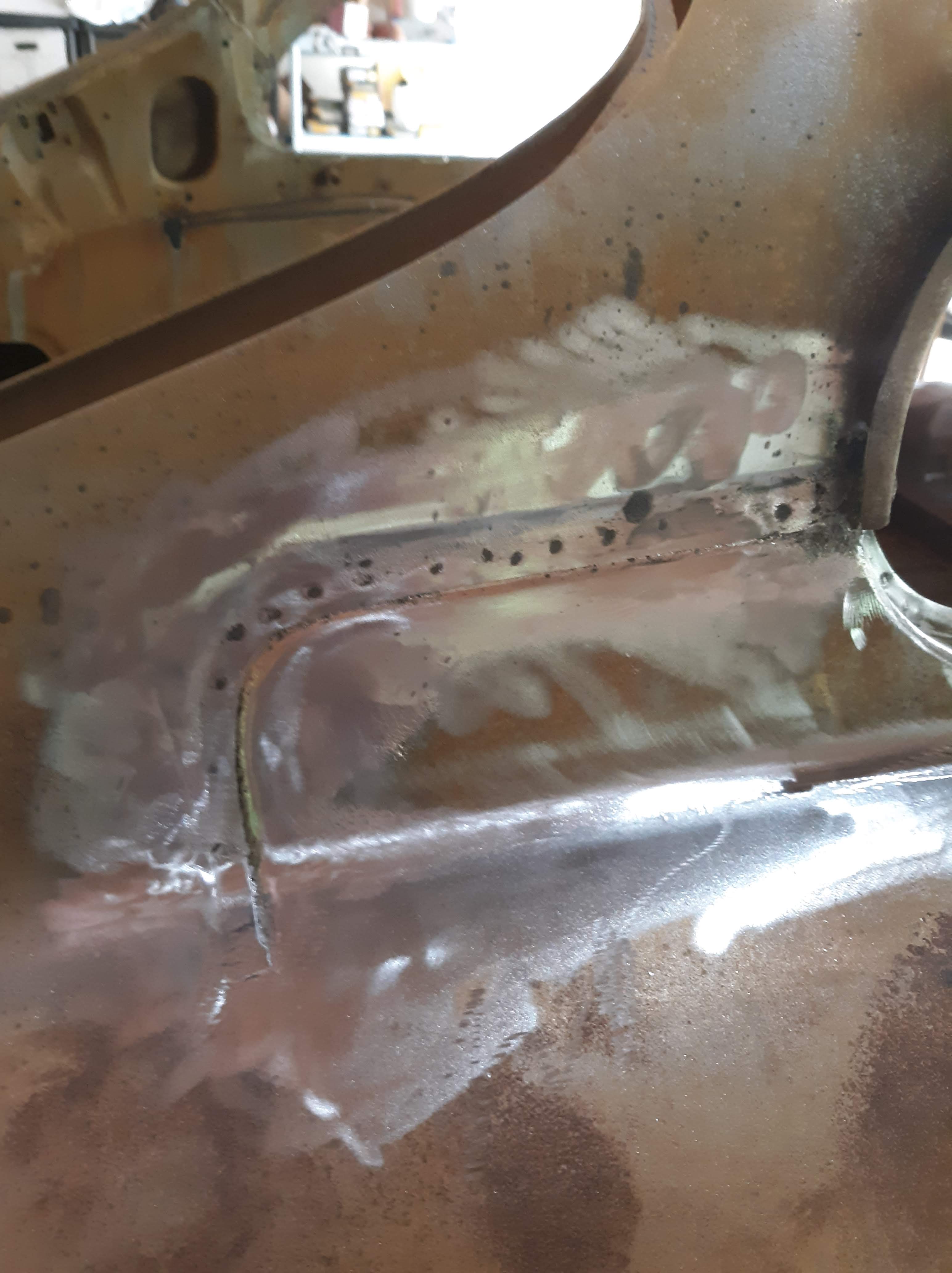 I spent a fair amount of time repairing small defects to the floor pan. There were quite a few gouges and some through holes that resulted from having to cut out the previous metalwork in the floors. My go to for this kind of repair is a 2 part epoxy clay that I buy from POR15. It is easy to mix and dries hard as nails. It is more usuable than say JB Weld as, being a clay, you can form it and squish into cracks and holes.