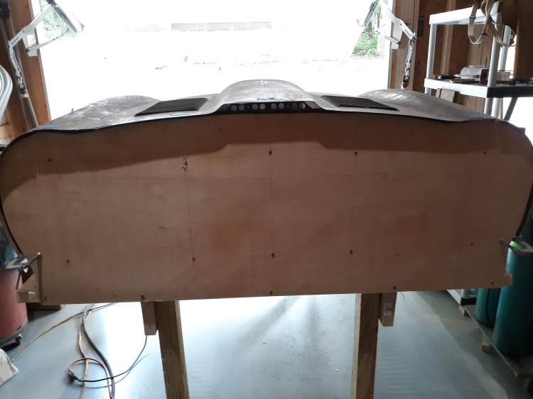 I pulled a lot of dimensions from my body shell with the engine frame, picture frame, and bonnet support frame to make my buck dimensionaly the same as the car. Next I built a wooden mockup of the Underpanel Assembly, thinking Richard would need something solid to hammer against. This mockup establishes the plane of the joint line to the bonnet center section and also the location of the holes for attaching the center section and the wings. From there I assembled the center section and the wings on the buck. I then fabricated 5 longitudinal diaphragms out of plywood, one on the centerline at the power bulge, two symetric ones out near the joint for the wings, and 2 in between. They are hard to see with the bonnet assembled but here is a photo I took later after removing the sheet metal.