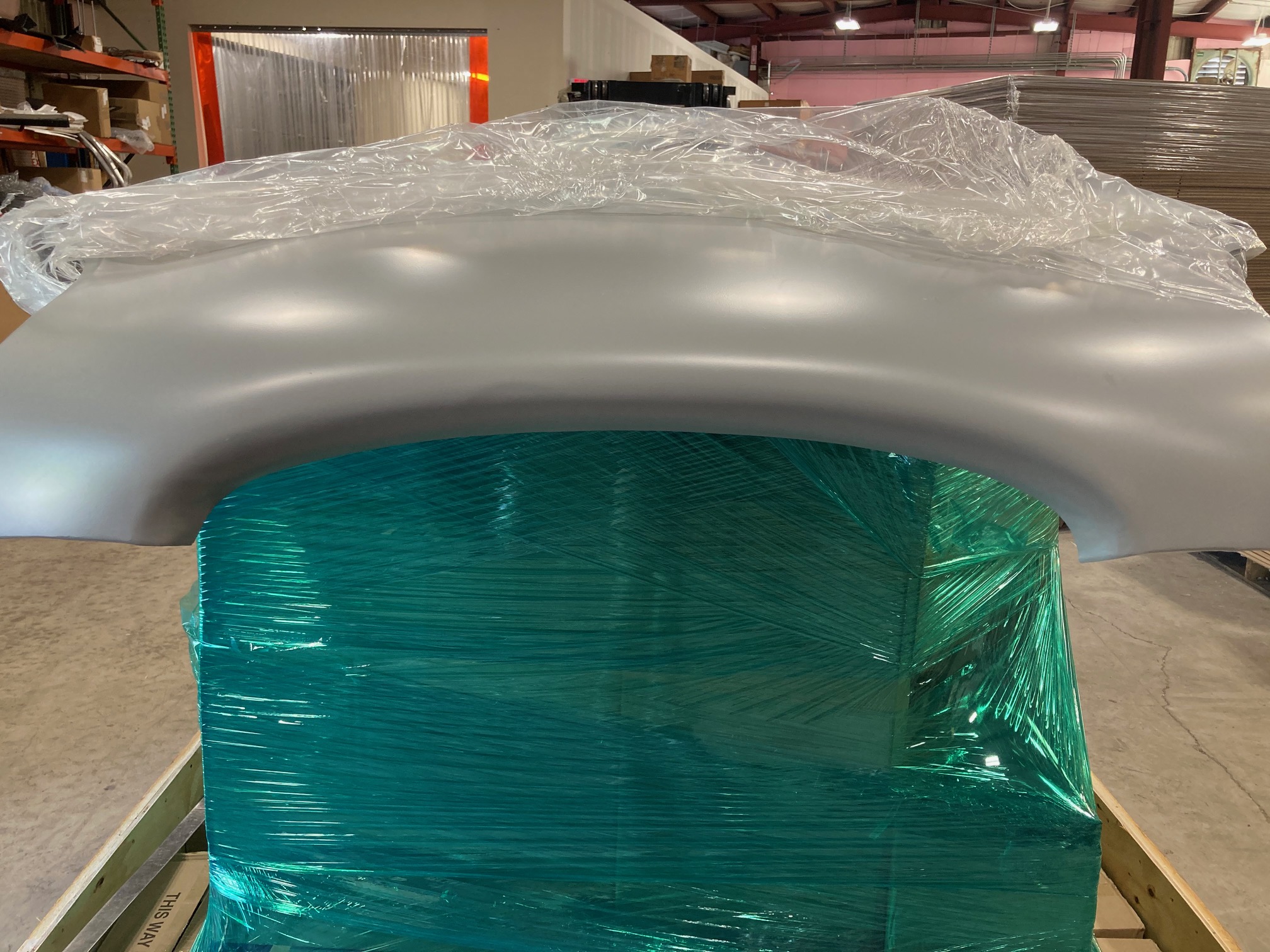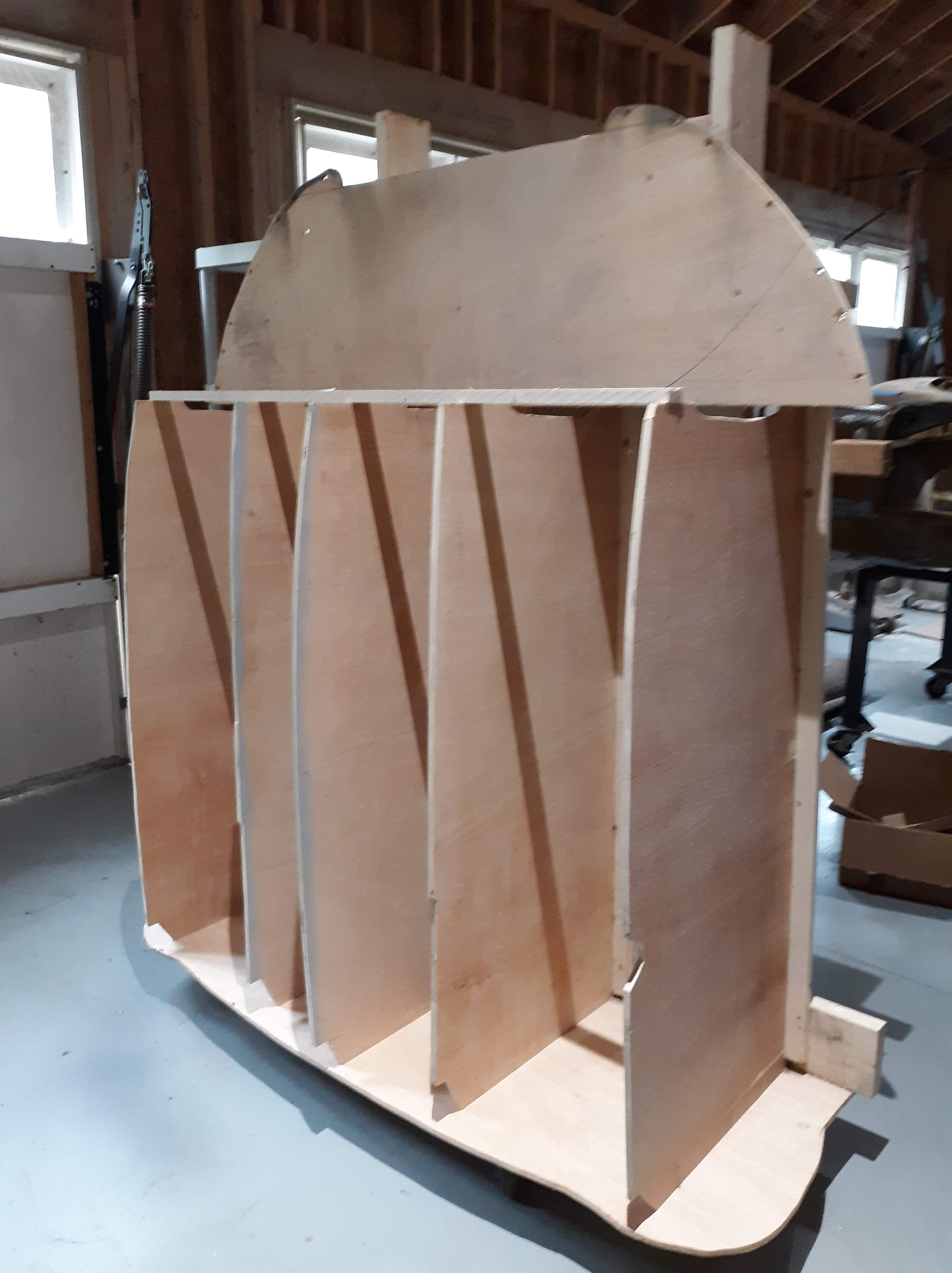 The first question is what should the air intake opening look like? I reviewed a lot of photos and also had access to several period Jaguar design drawings. All pointed to the fact that the opening should be symetric about a horizontal centerline coincident with the joint line of the sheet metal, which also is roughly the centerline of the motif bar. From the above photo you can see that my center section has been squished down, probably by contact with the ass end of some American vehicle. Richard asked for a template to work to. I immediately envisioned a nice “body buck” made out of segments of wood that he could work to. Done correctly, a wooden body buck would be garage art in it’s own right. I started by building a frame and templating the firewall shape, which I cut out of 1/2″ plywood.