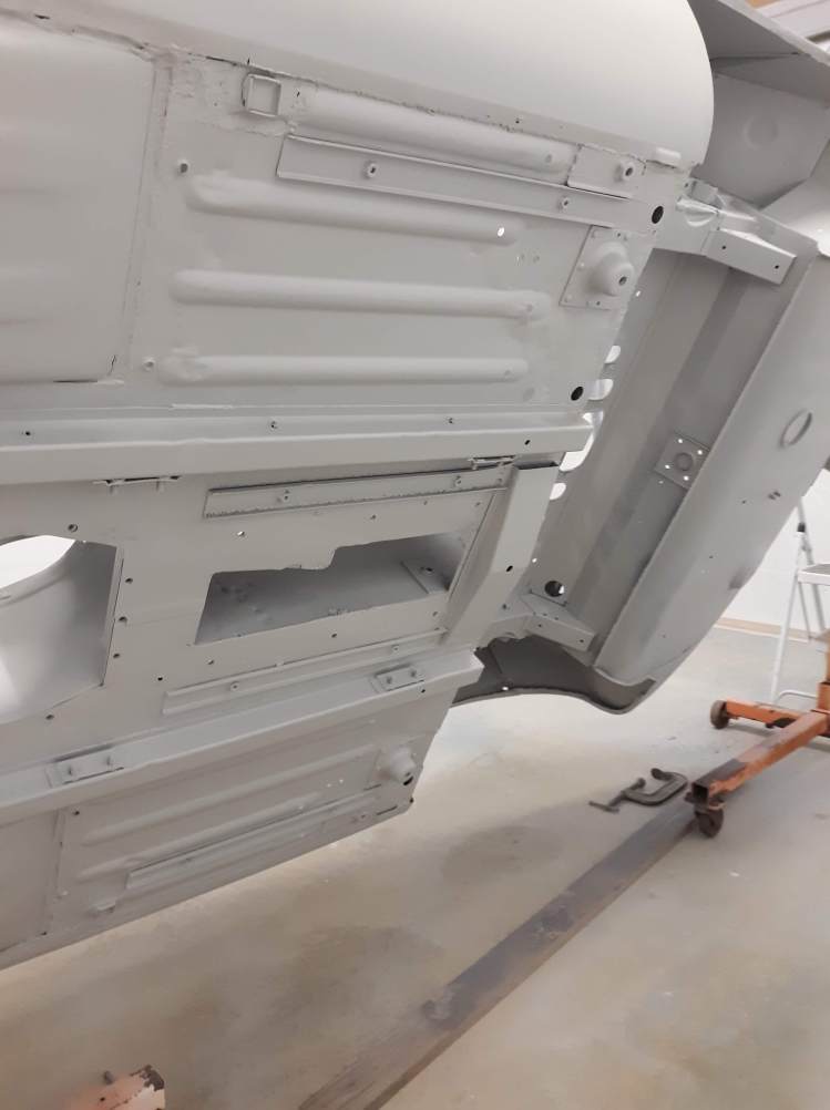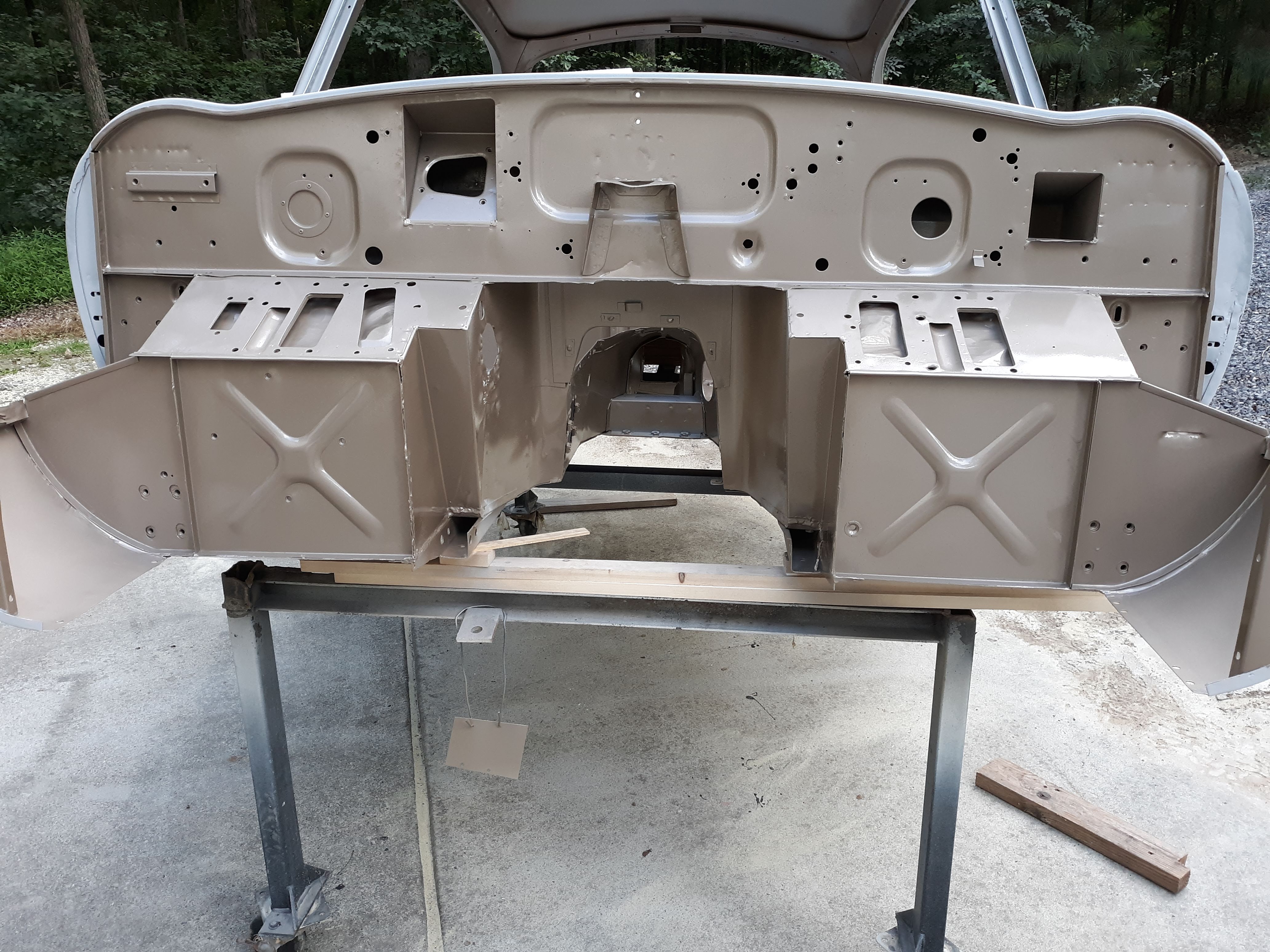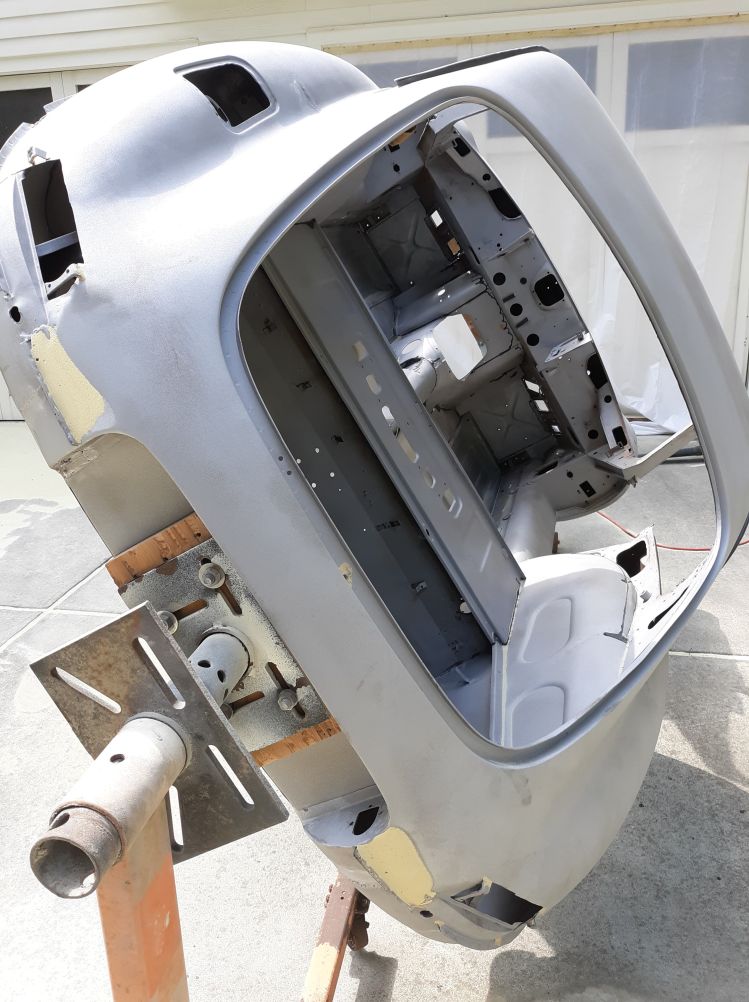 So that was the tutorial, here are some pictures. The color is Opalescent Golden Sand, as she was built with back in 1963. The epoxy primer is grey.