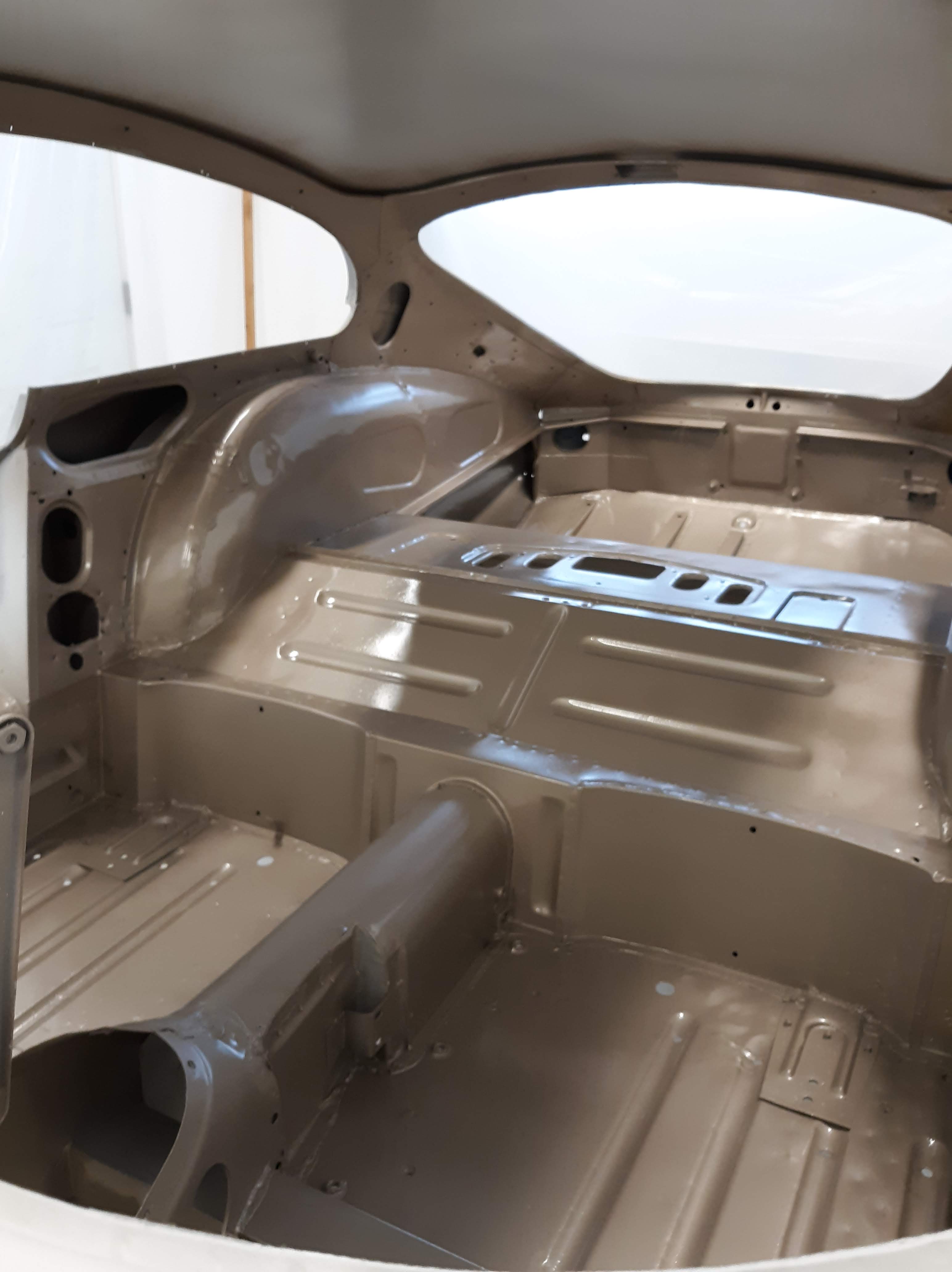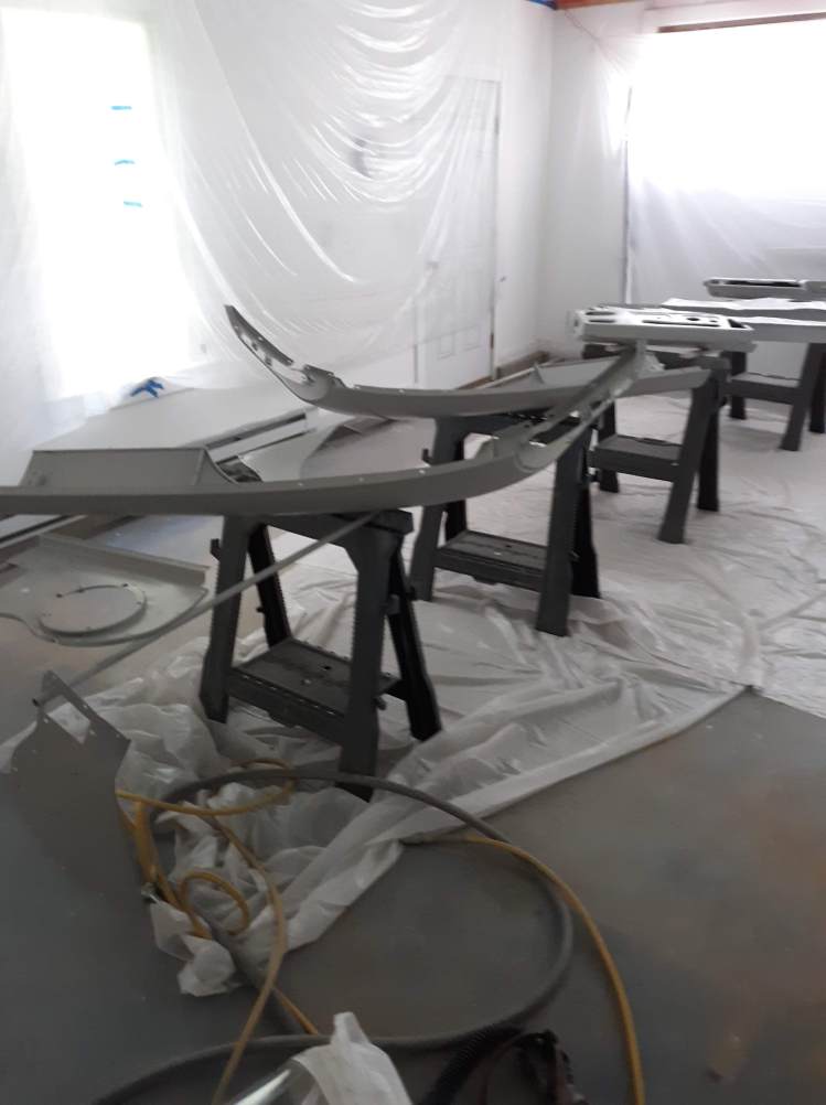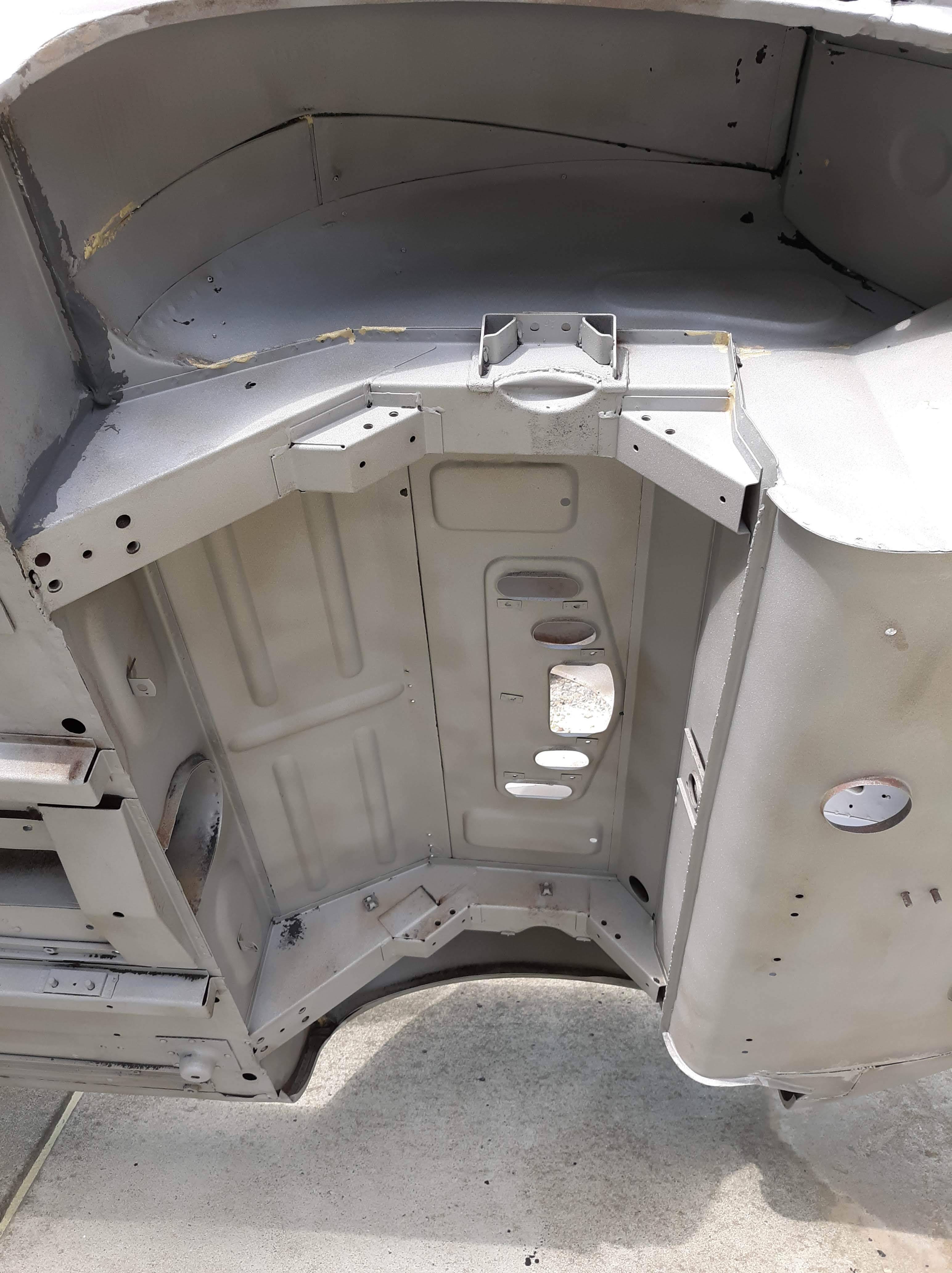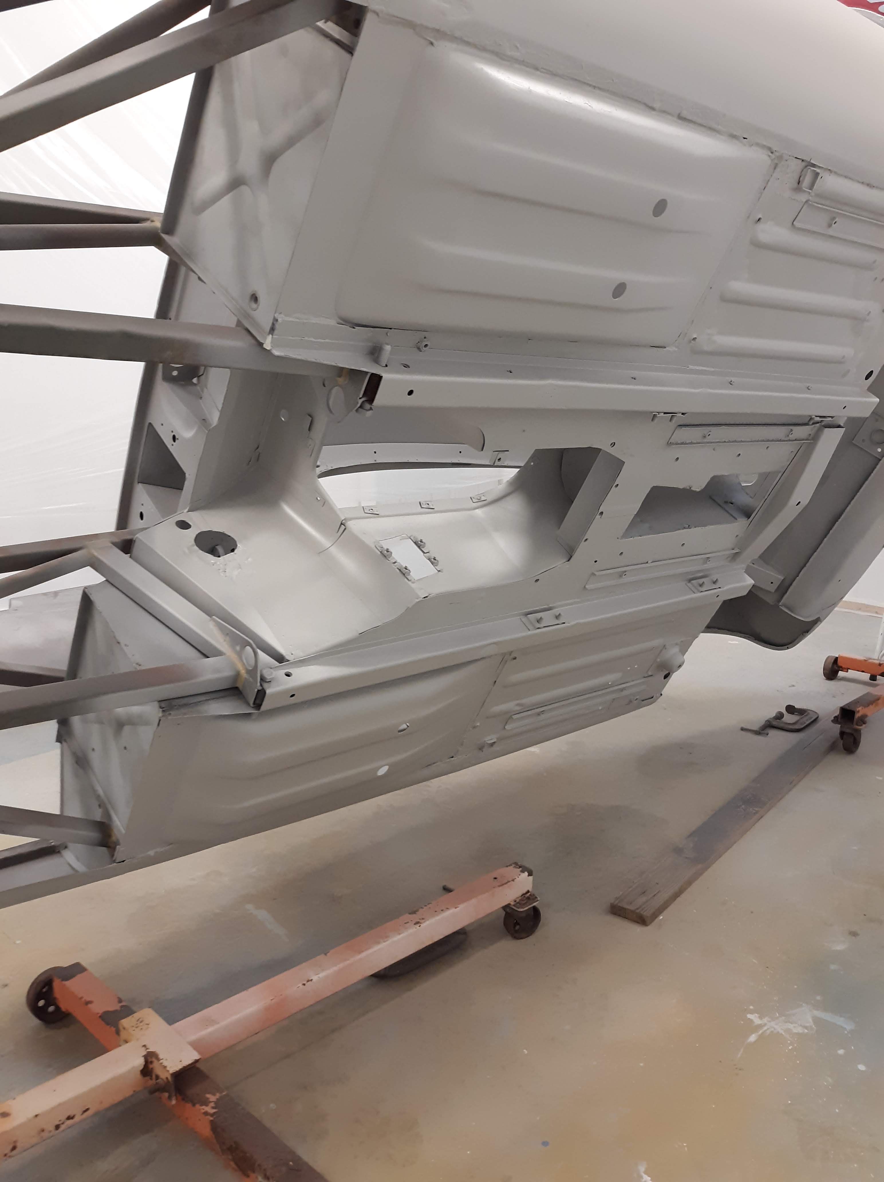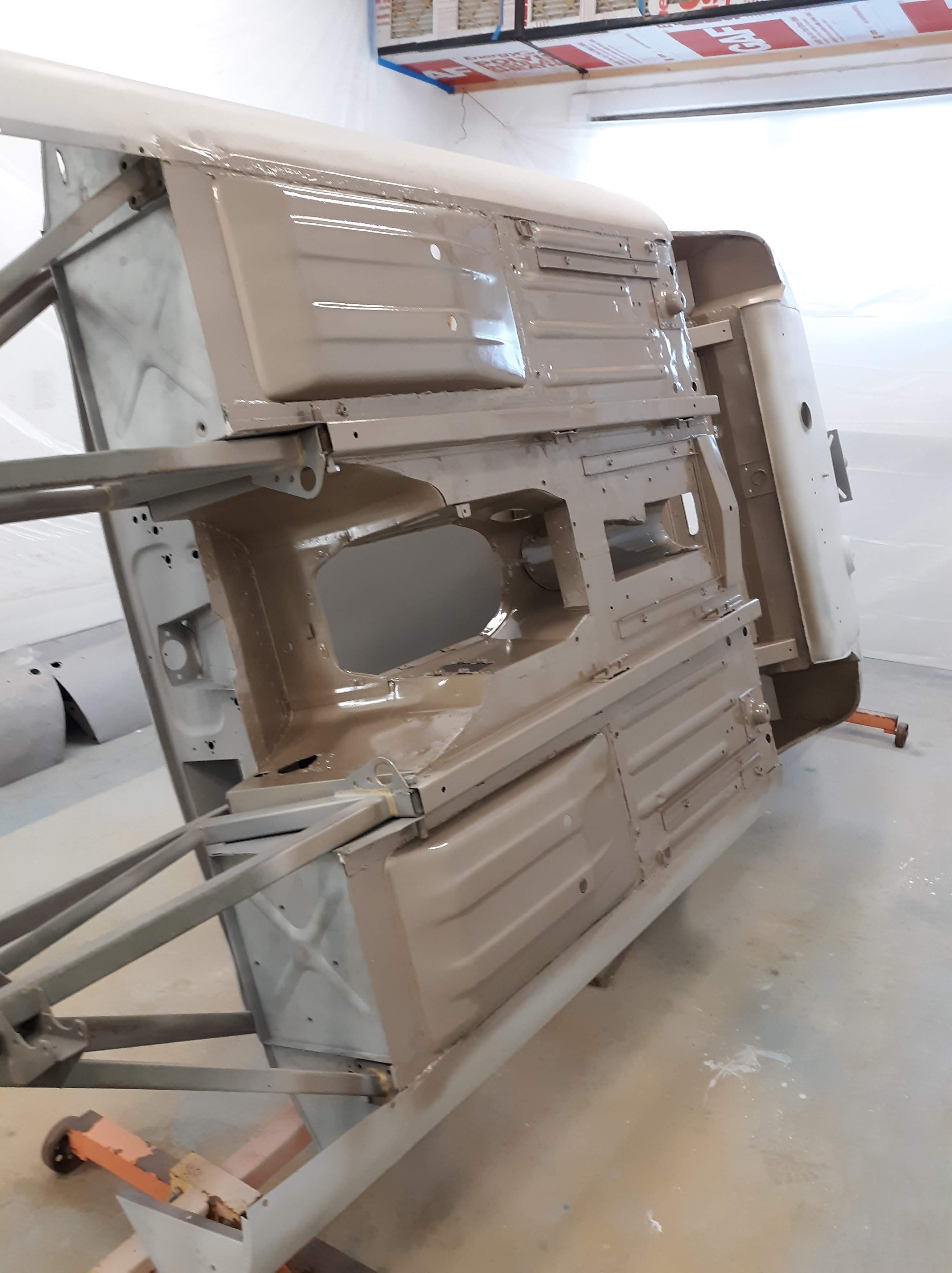 I am not a robot (check the box) and my environment is not so clean as theirs. As I have discussed in previous articles, I use a more time and labor consuming but methodical approach. As a general approach for this car, I had the body shell media blasted, Then I made metal repairs that required welding or adhesive bonding. Then I had the body media blasted again, just earlier this week. I also had a bunch of loose items like the bonnet fenders, doors, bonnet air ducts, bonnet underpanel, and bonnet diaprhagms bead blasted. All of these items were moved into a low humidity environment (my paint booth) and I proceeded to apply paint. Everything received 2 coats of epoxy based primer. Then I diverged into two paths. The body shell interior, underside, and firewall were continued with the application of a color tinting basecoat and a clearcoat. This was done as a wet on wet process. The remaining components will receive much more prep work before final painting.