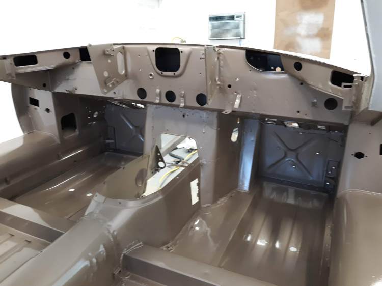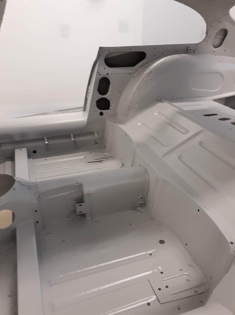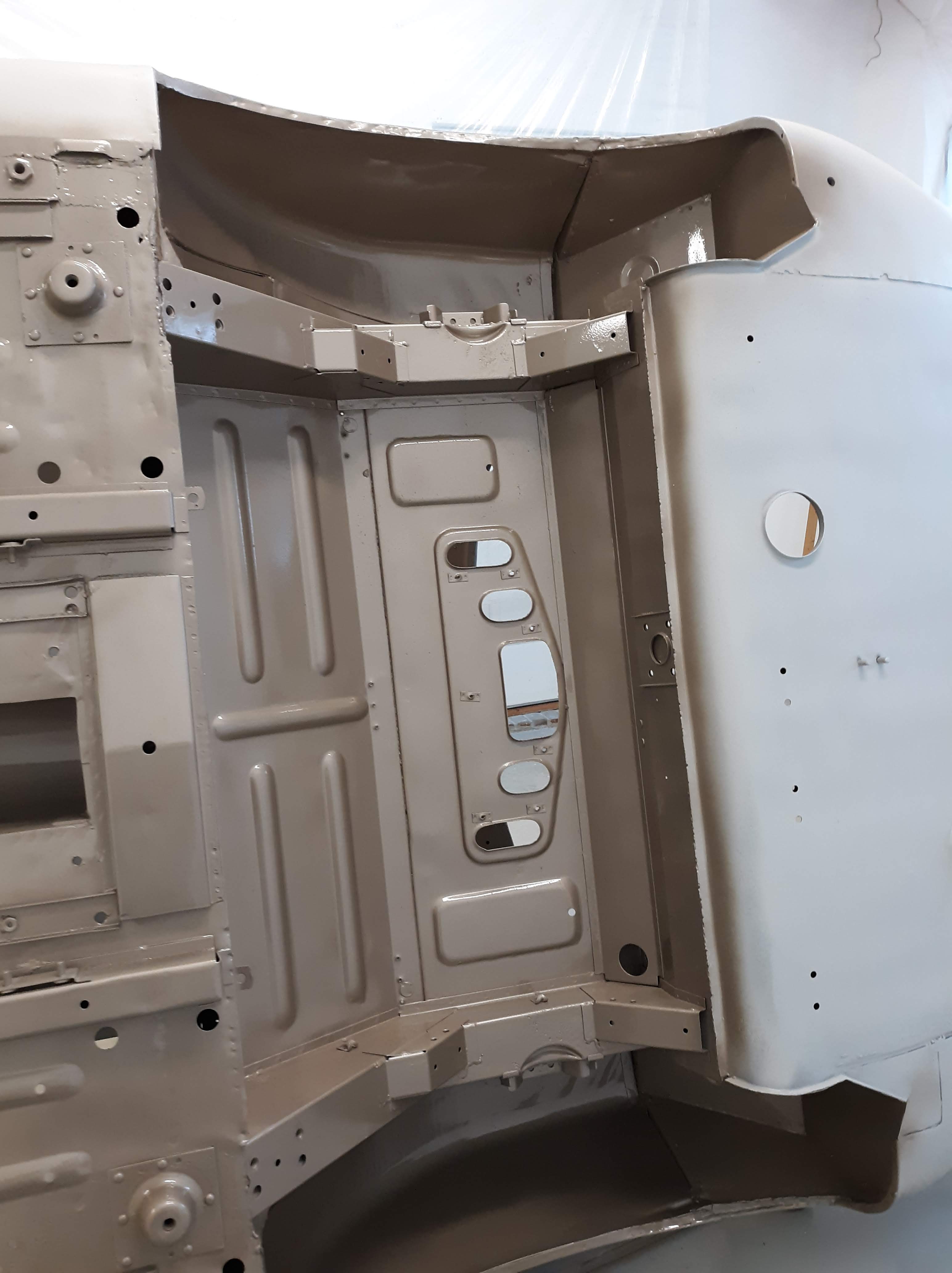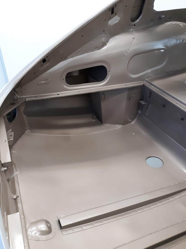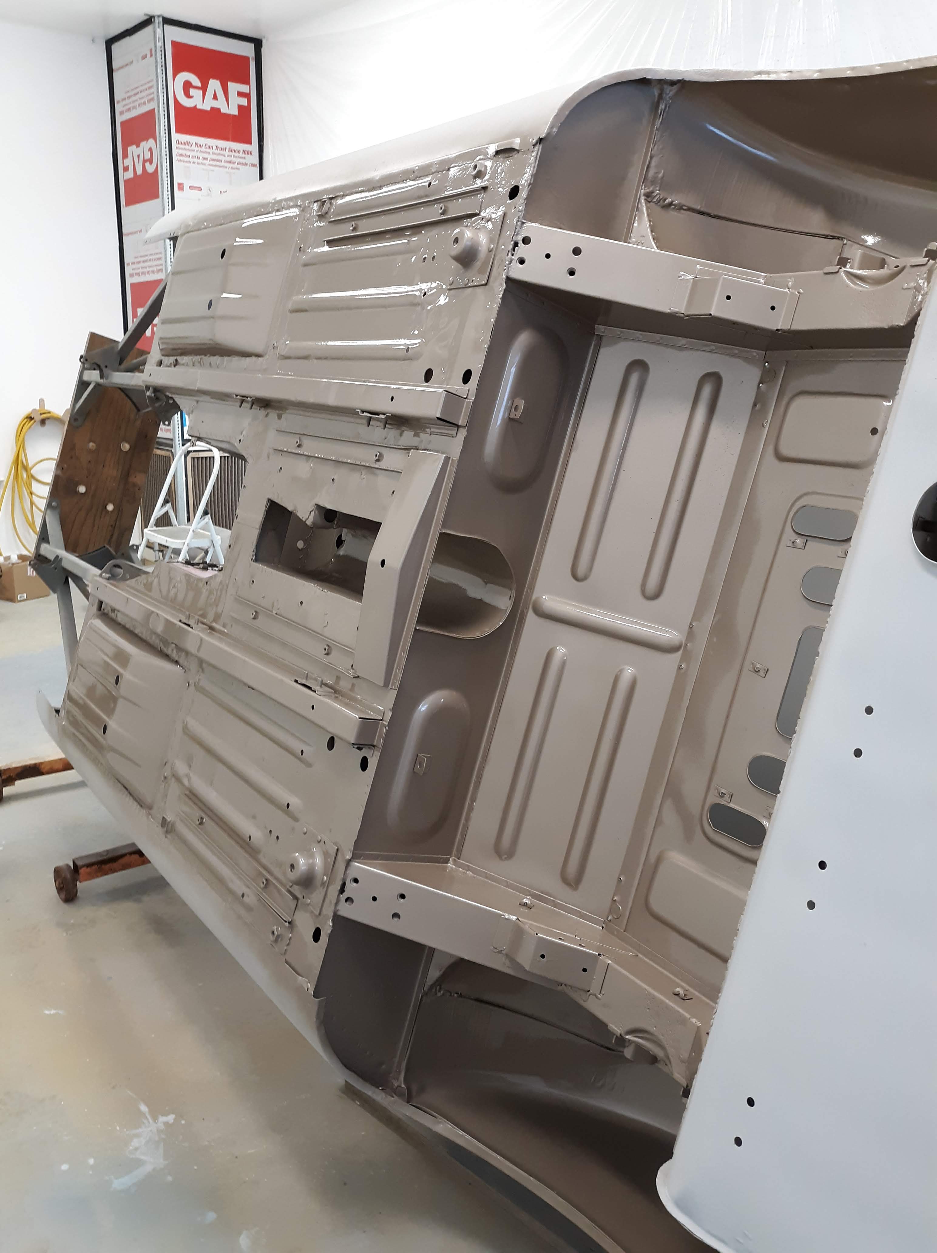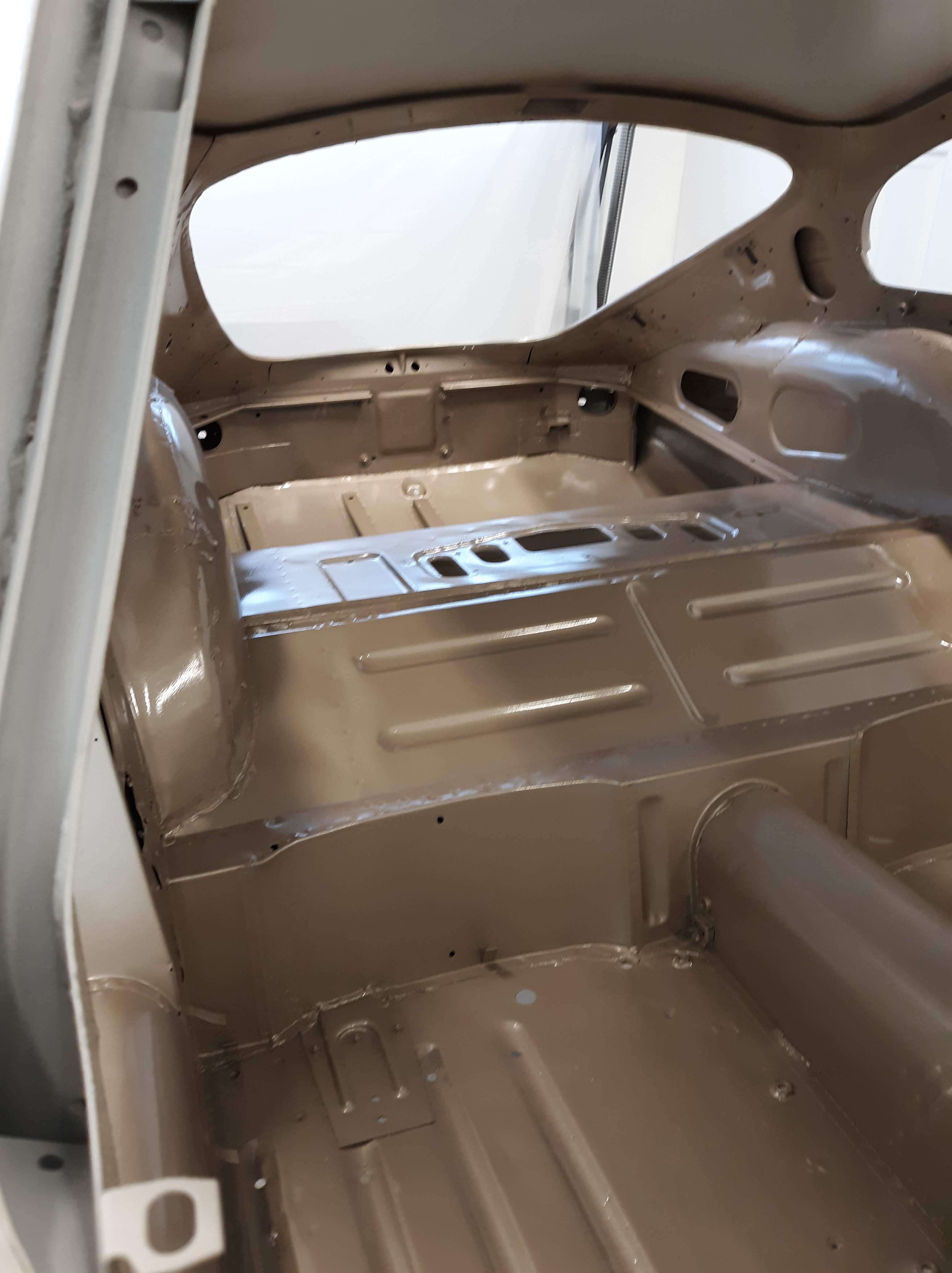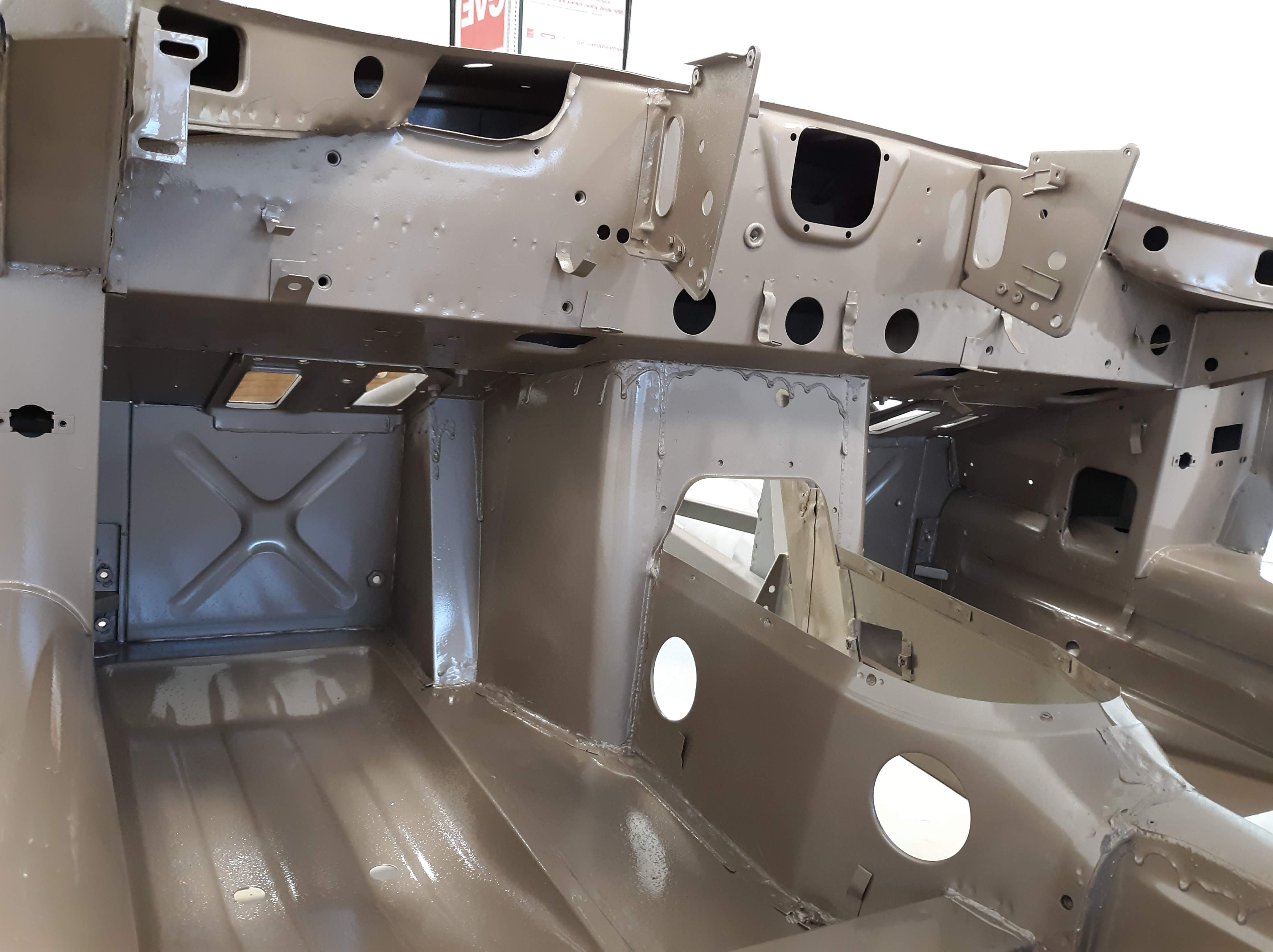I am not a robot (check the box) and my environment is not so clean as theirs. As I have discussed in previous articles, I use a more time and labor consuming but methodical approach. As a general approach for this car, I had the body shell media blasted, Then I made metal repairs that required welding or adhesive bonding. Then I had the body media blasted again, just earlier this week. I also had a bunch of loose items like the bonnet fenders, doors, bonnet air ducts, bonnet underpanel, and bonnet diaprhagms bead blasted. All of these items were moved into a low humidity environment (my paint booth) and I proceeded to apply paint. Everything received 2 coats of epoxy based primer. Then I diverged into two paths. The body shell interior, underside, and firewall were continued with the application of a color tinting basecoat and a clearcoat. This was done as a wet on wet process. The remaining components will receive much more prep work before final painting.