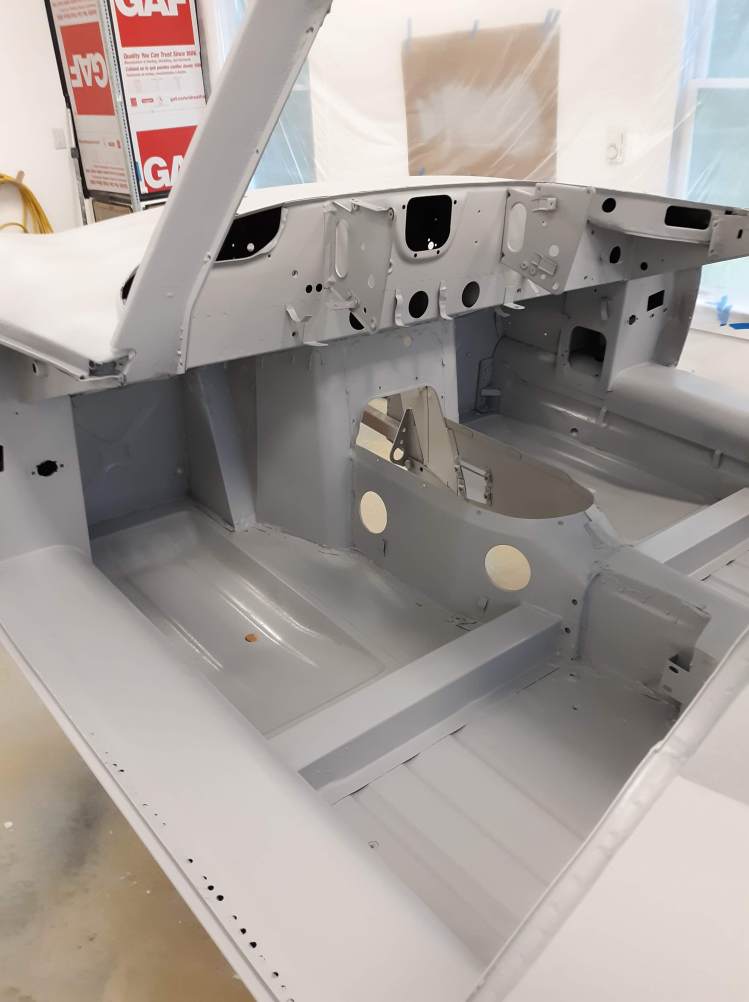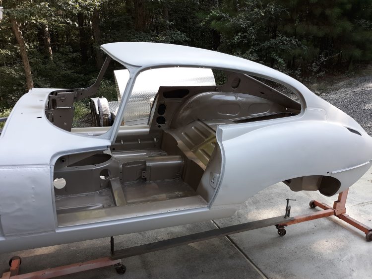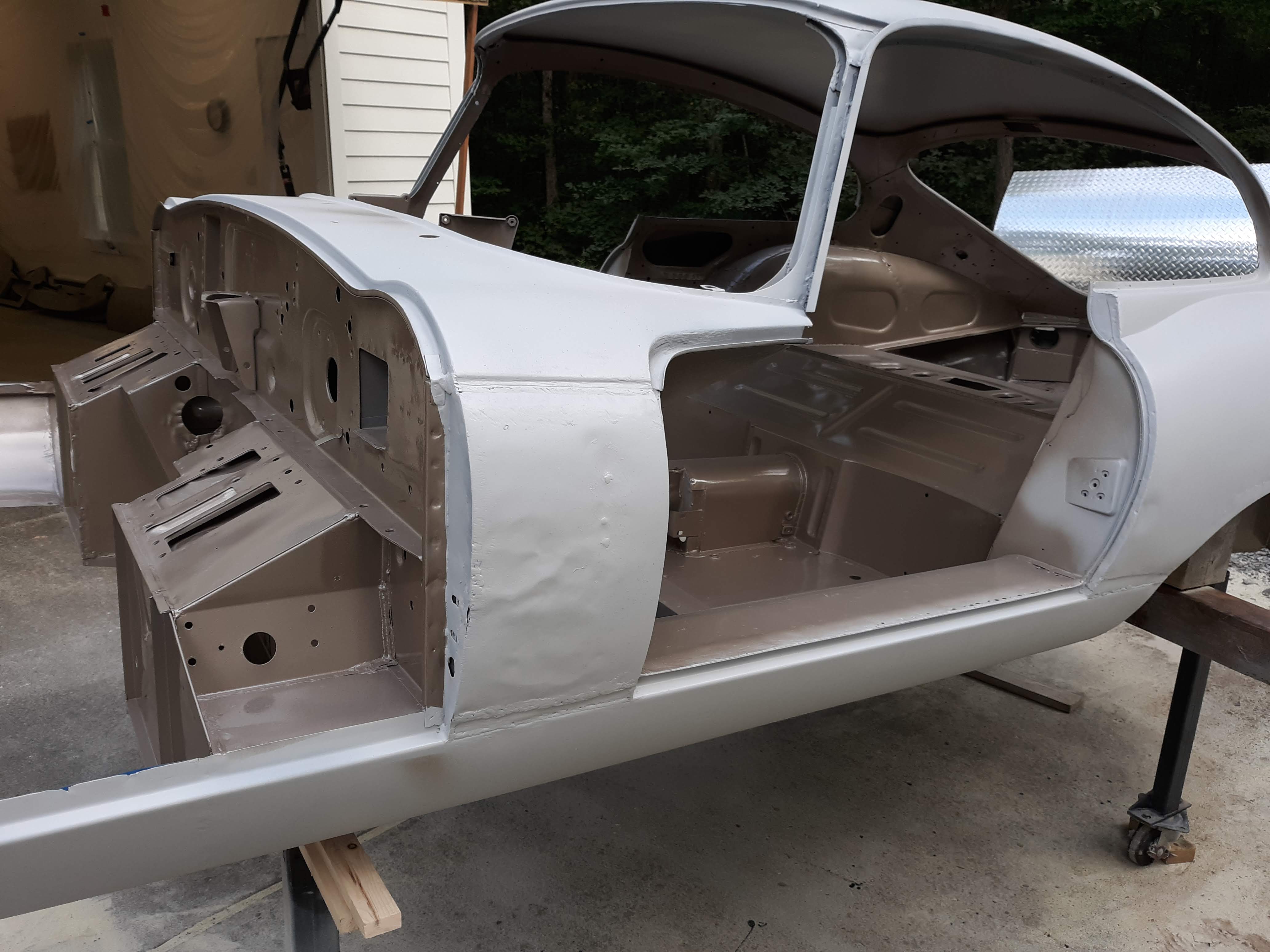 Painting has begun on the 1963 Etype FHC restoration. This might seem a little early in the process but let me explain. As near as I can tell, the factory assembled the bodies fairly completely and then painted them, inside and out, with either enamal or laquer paint. Both products have fallen out of favor for use as modern automotive paints. Almost all cars built today are dipped in a anti-corrosion bath and then painted with urethane based paints. Most cars are painted with a basecoat (the color) and a clearcoat (the shine and durability). Somewhere in there, they must have a step where they smooth out minor imperfections in the body but it all goes pretty quick and is largely done with robots in a very clean environment.