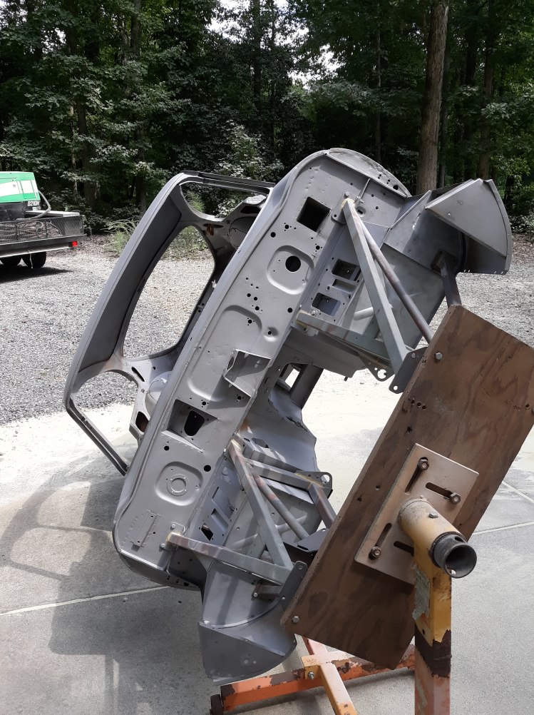 The first step was a visual evaluation of the bodyshell and the bonnet pieces. Generally, everthing looked pretty good. But I noticed that several parts, namely the footwells and the footwell and sill closing plates were not factory pieces, rather they were just fabricated from flat plate. I ordered genuine factory pieces from SNG, cut out the old pieces, and installed the new pieces. Next, a mobile media blaster showed up and reduced all my panels to bare metal. Fortunately, even with all laid bare, no rust was found. My above introduction is a little off here. For large parts of the body, I was able to go immediately to paint. I primed and painted the inside of the cockpit, the bottom of the cockpit, and the firewall. The rest of the car received epoxy primer.