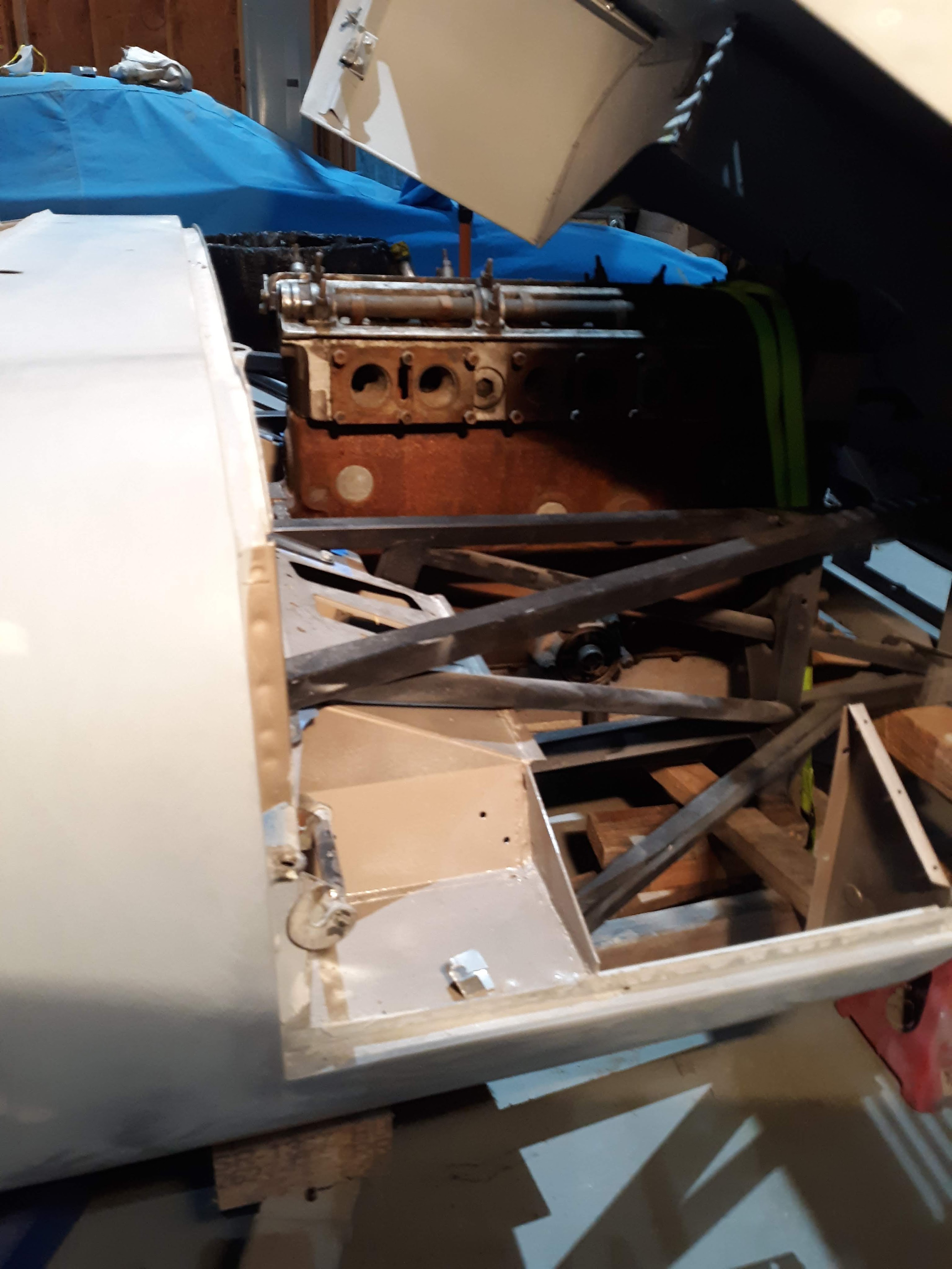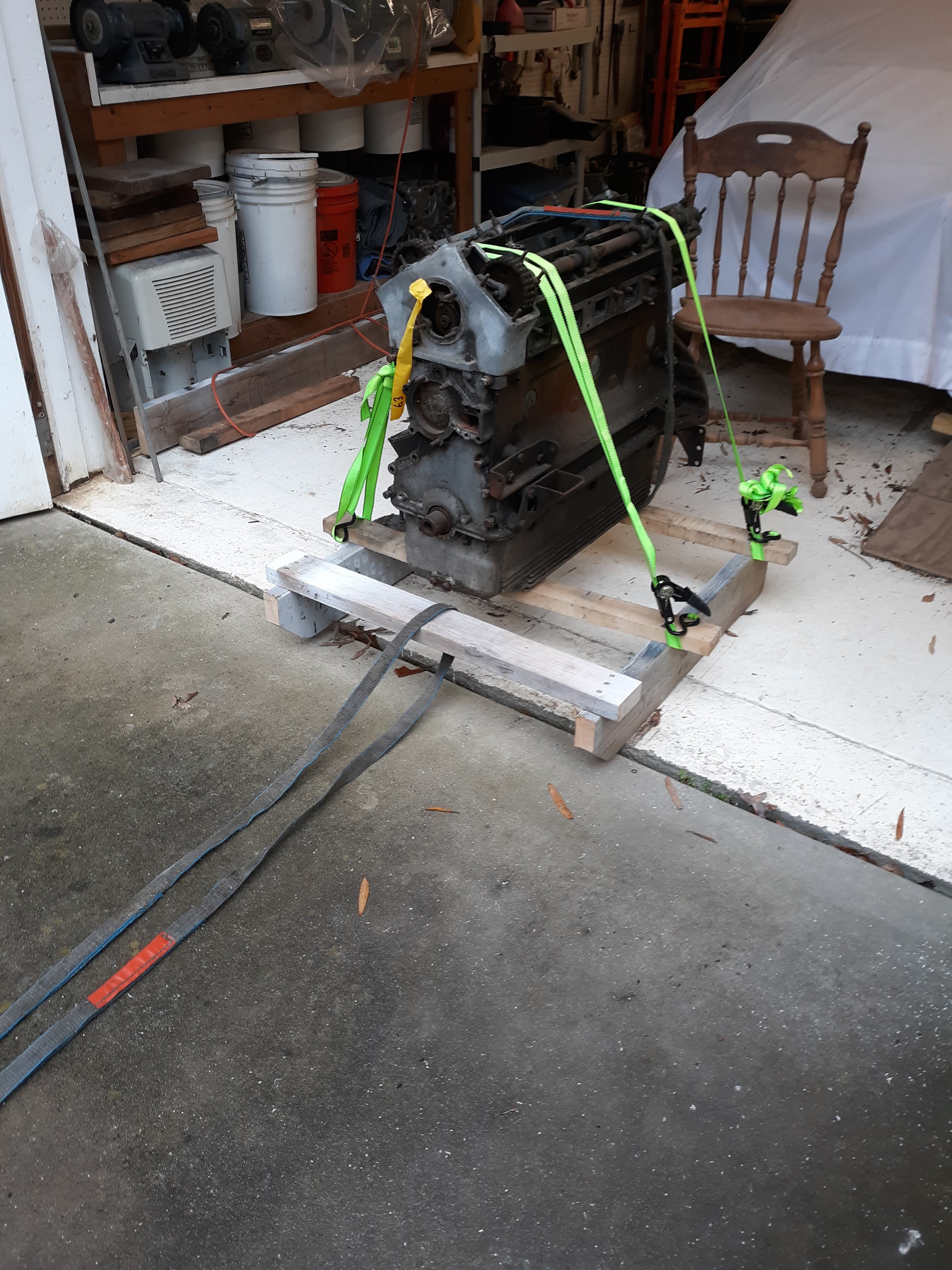 Anyway, I have reached a good point with the main body shell and decided to move to the bonnet. One issue that has been bugging me is how the bonnet would move when the weight of the engine was applied. My actual engine and tranny are with Coventry West for rebuild. But, I have a spare 3.8 engine and tranny. I decided to install them so I could make my final (hopefully) fitment of the bonnet to cowl. This was an interesting event. The engine weighs a lot! 400 pounds? Whatever, it was in one building and the car was in another. A problem with the building where the car is located is that it really doesn’t have a good rigging point to pick heavy weights off a truck or trailer. I decided to channel my inner pyramid builder. I built a “sled” out of wood, put the engine on it, and dragged it behind my truck from one building to another. It made some serious gouges in the gravel road but I did it.