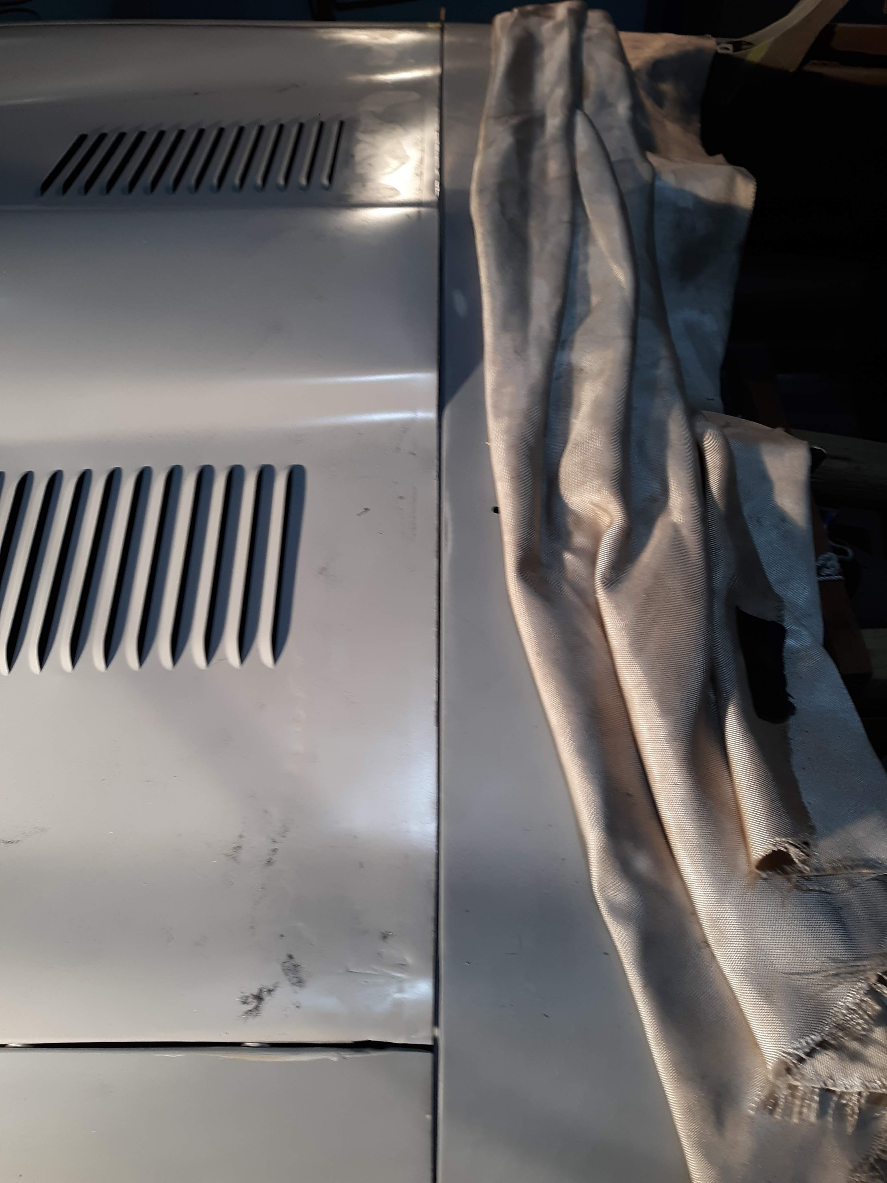 Which leads me to the other big event. I made the final cuts on my bonnet center section back edge. As noted previously, the replacement bonnet center section is delivered long. I had made several preliminary cuts but had left the last 1/8″ or so in reserve. Now that I had the weights set, I lowered the bonnet and evaluated the gaps. First, I was able to remove some of the shims on top of the hinges, which had the effect of opening the gap back up that had been compressed by the weight of the engine. Once I reached the best compromise with shims, I attacked the latch mechanisms to obtain the best combination there. Finally, I traced a consistent line from the cowl edge to the bonnet center section and marked it with tape. I was shooting for a 1/8″ gap. It was time to cut!