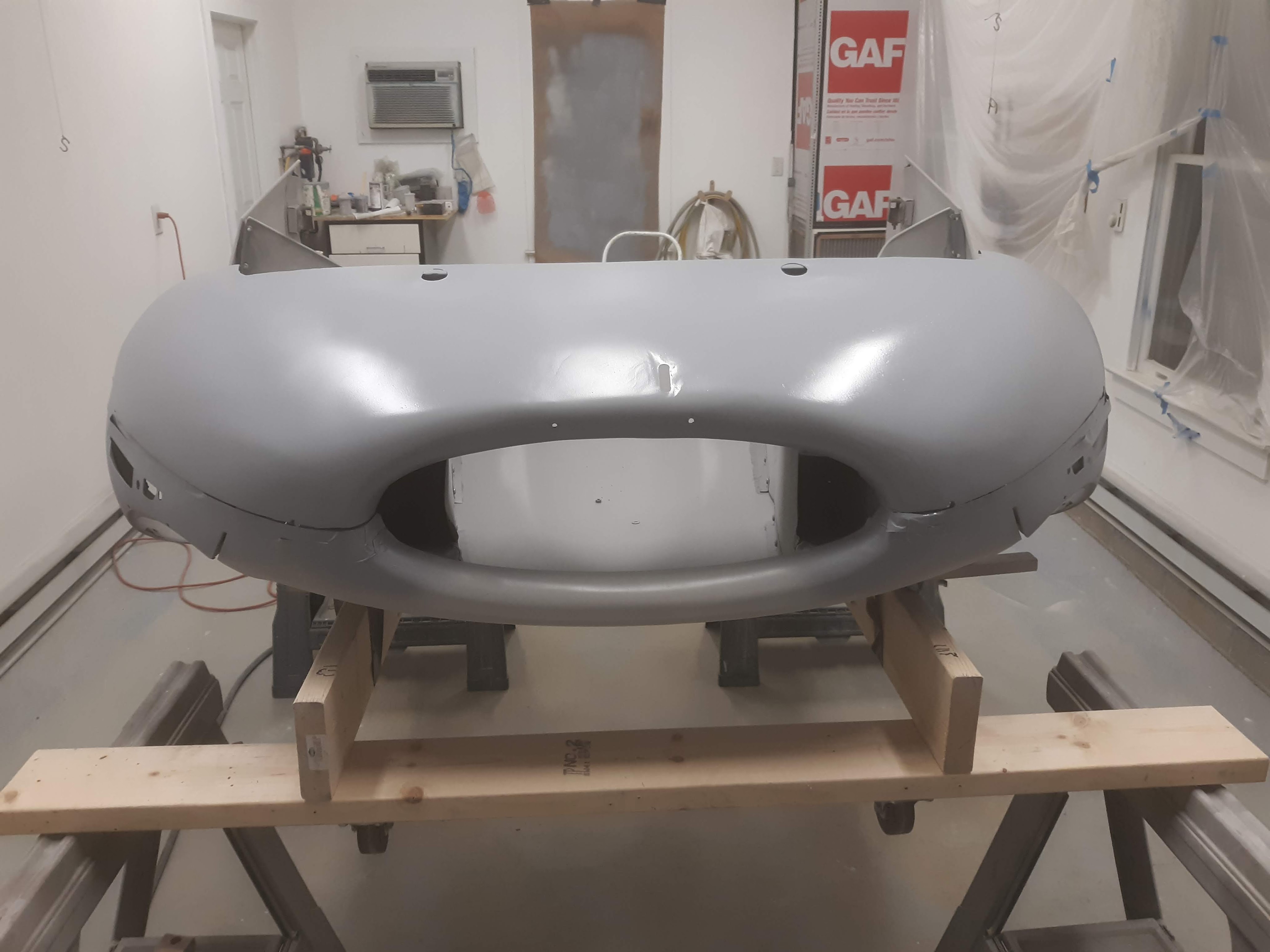 When I last posted, the big news was that I had recovered from my primer fiasco and was back to progress. Discussing progress with regard to paintwork is a little like a broken record. Apply primer. Sand. Inspect for blemishs. Repeat. The good news is that I am very close on the main body shell. After doing an overall sanding of the body shell with 320 grit, I have just a couple of “sand throughs” that I will need to deal with. In this case, sand throughs are spots where the underlying product, typically polyester filler, shows through. As it contrasts against the grey of the primer, it represents an area that might “look funny” if color was applied over it. To be safe, I will apply some local shots of high solids primer (Glasurit 285-60) to get a uniform grey color.