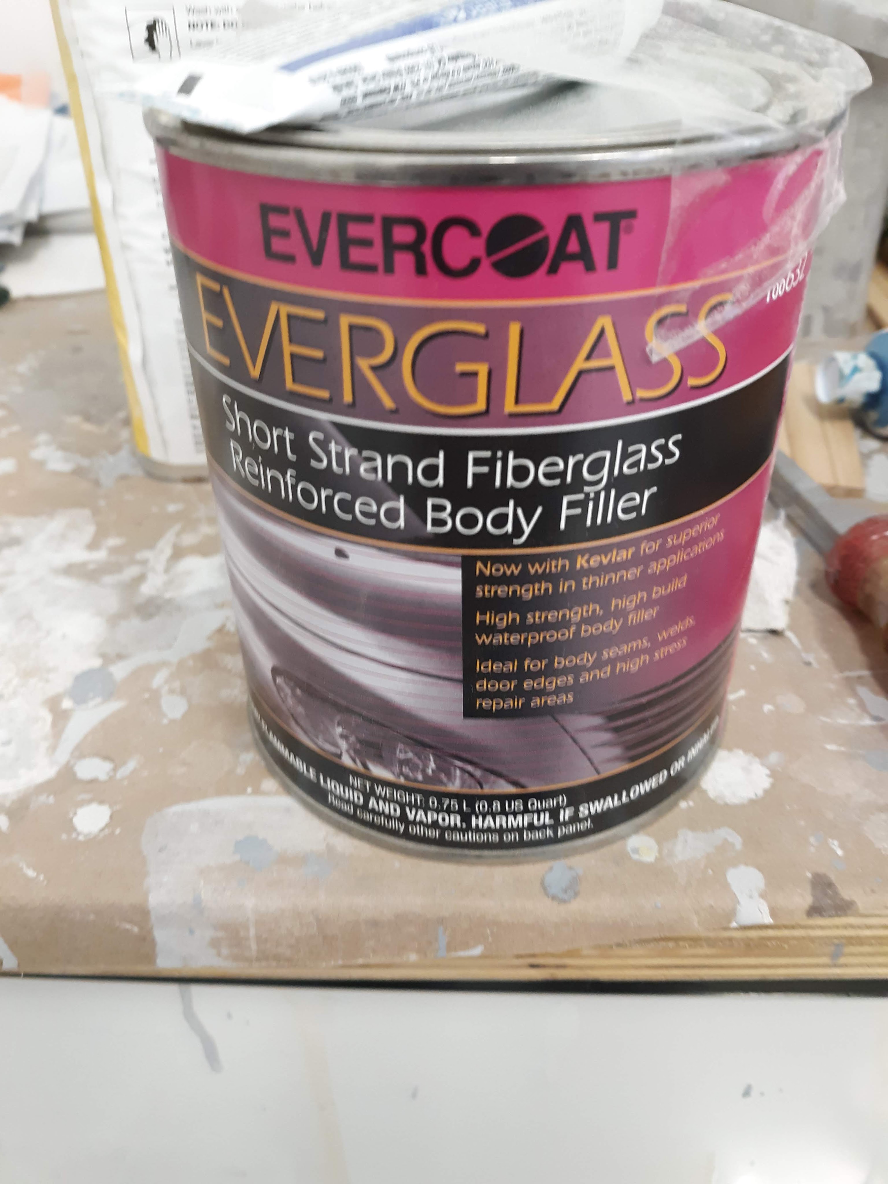 Once I released the bonnet center section from the wings, I was able to hammer and dolly both issues away. But I was worried that they might come back. I decided to add some stiffness to the metal. The way I went about this is as follows. I purchased a can of Evercoat body filler that is mixed with short Kevlar fibers. Not many years ago, it would have been plain spunglass fibers but Kevlar is the current fiber of choice.