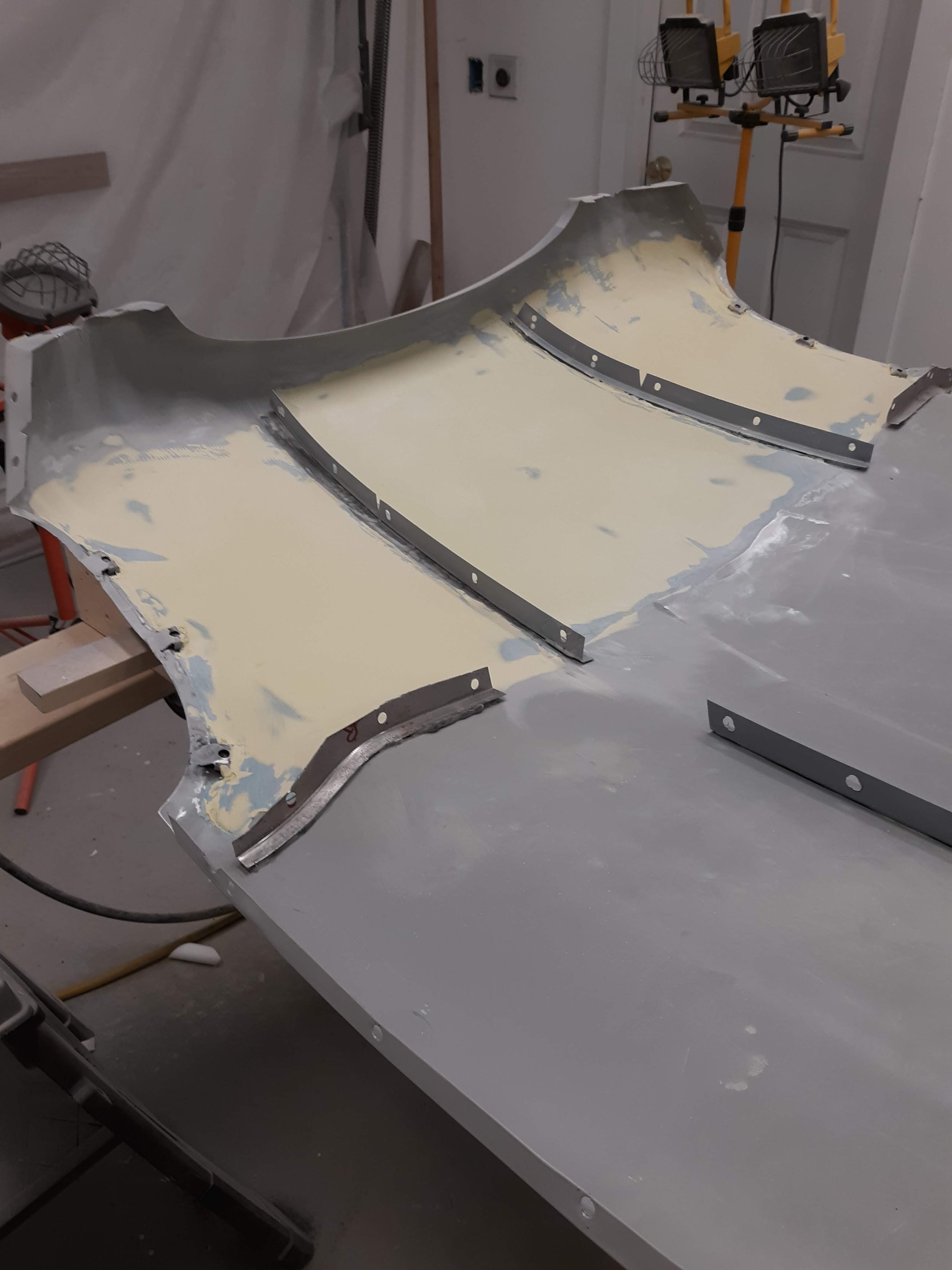 An interesting thing happened while I was block sanding my bonnet center section. I found a wrinkle and a bump. The wrinkle was next to the passenger side headlight opening. The bump was next to the driver side headlight opening but closer to the power bulge. Both were subtle but block sanding reveals this sort of thing, both by observing the sanding pattern of the guide coat and just by sense of feel with your hand. A little research determined that other restorers have experienced similar problems. Since my bonnet center section is new, I am sure these developed recently. I would note that the match of the flanges of the bonnet center section to the flanges of the wing panels required some force, using clamps, to get the flanges to align. I suspect the forces placed into the panel found an outlet at an adjacent weaker point. As my friend Rick observed “the bonnet center section is like a floppy taco”.