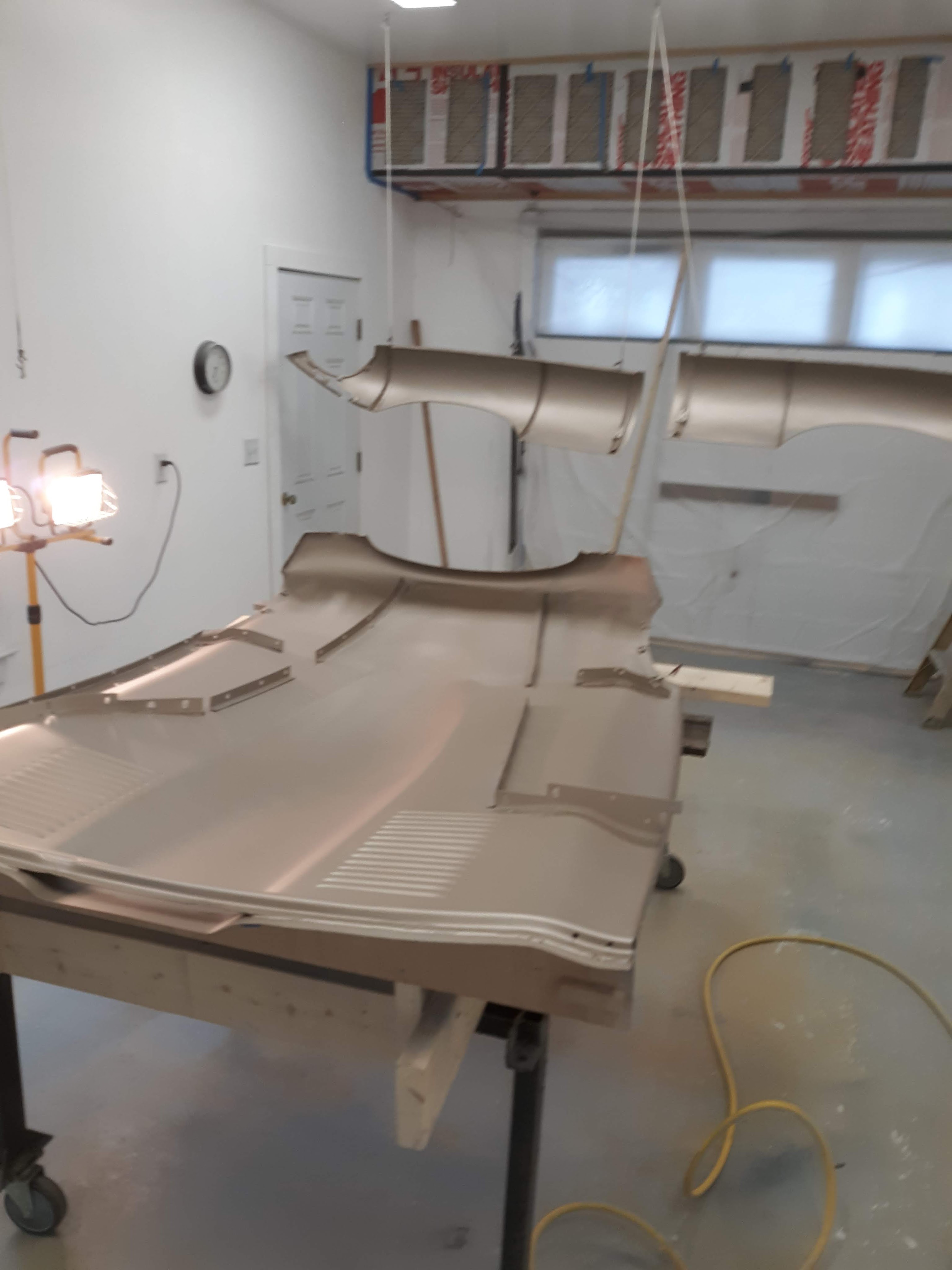 This week’s milestone activity, if you will, was painting the underside of the bonnet. Basically, the steps leading up to this point were media blasting the parts (last summer!), application of epoxy primer (also last summer!), following by a long period where bonnet fitment occured, followed by application of filler to correct minor issues, following by sanding with 320 grit dry, and 600 grit wet. The actual painting involved getting the paint booth cleaned out, heating the booth to 70 degF (no easy feat in the cold weather we are experiencing), following by 3 coats of Opalescent Golden Sand color, followed by 4 coats of clearcoat. For this go-around I only painted the center section and the wings.
