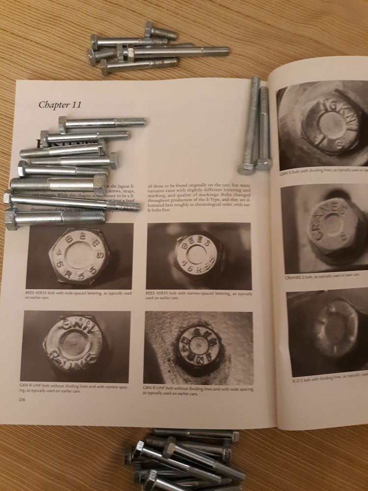 An important originality issue was the head markings on the bolts. Steve’s article, Dr. Thomas Haddocks book Jaguar E-Type 6 & 12 Cylinder Restoration Guide, and the UK Etype Originality Forum were all helpful. It turned out I had a mixture of BEES, GKN, and Rubery-Owen fasteners in my selection. FYI I think “Ruby Owen” in the JCNA document is a typo. Most articles on this subject agree that that there is no definitive rule on what suppliers bolts would go on a particular car. In my case, I was able to utilize period correct fasteners for all but 1 or 2 of the bolts I required. I also have a good supply of the correct “taller” nylon insert nuts, which had been sent to Industrial Electroplating for silver zinc plating. Here is a picture of the bolts I used laid next to the applicable picture in Haddock’s book. The ones on the top are the Rubery-Owens, which aren’t discusssed in Haddock but are discussed on the UK forum.