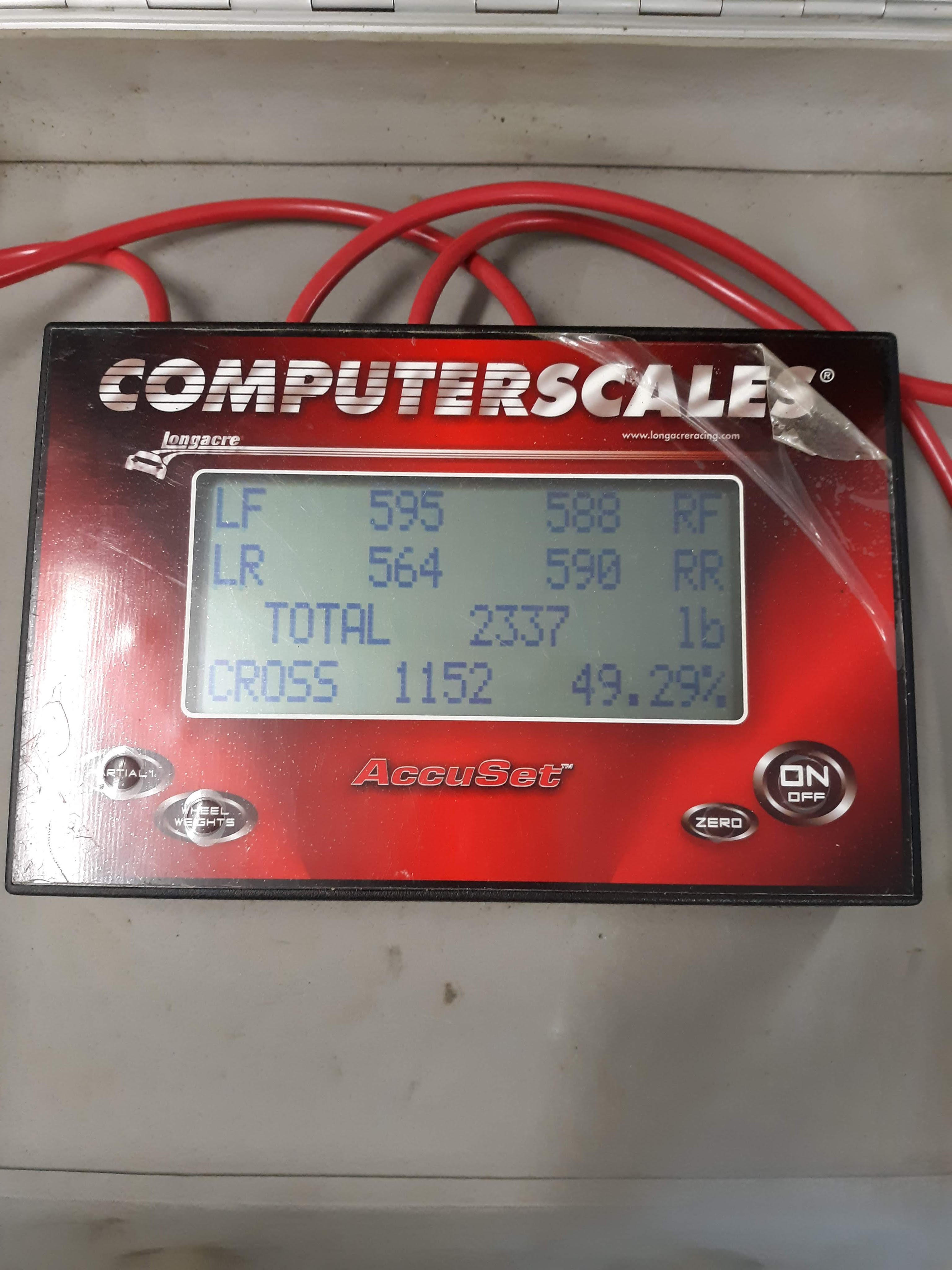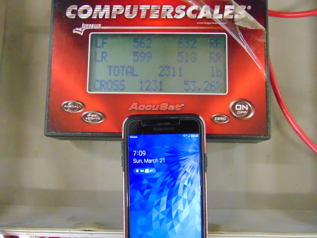 Update 1: When reviewing my photos of the corner balance scale readings, it leapt out at me that the total number was fine but the corner weights were not fine. I immediately knew what had happened. The 350# springs are short and on full suspension droop, they disengage from their seats. Normally when you drop the car back down they make a loud bang, which will scare the hell out of you the first time it happens. I just came in from putting the car on the scales again, this time making sure the spring seats were seated. These numbers are much much better 🙂