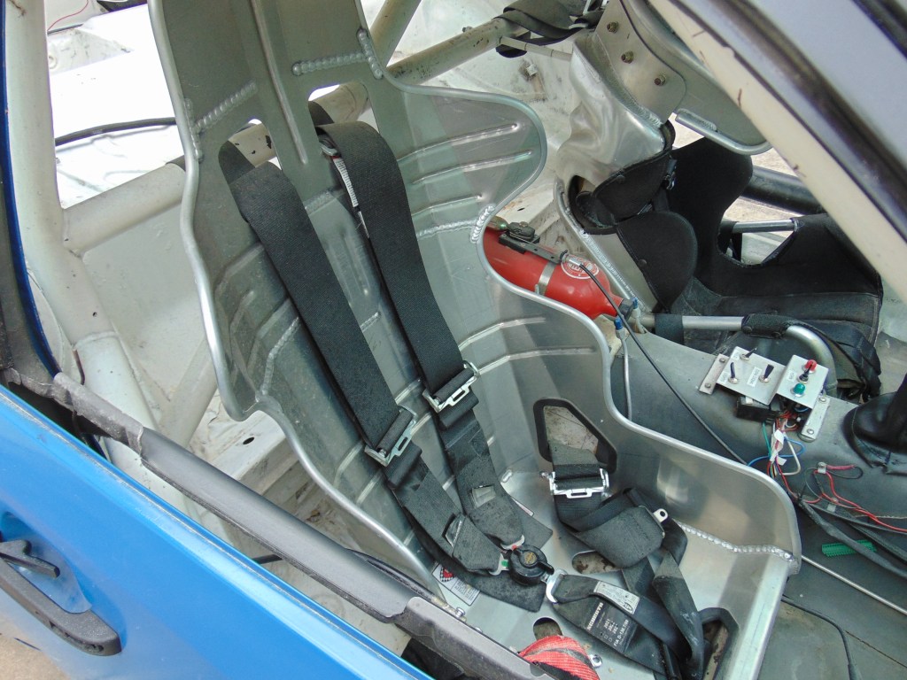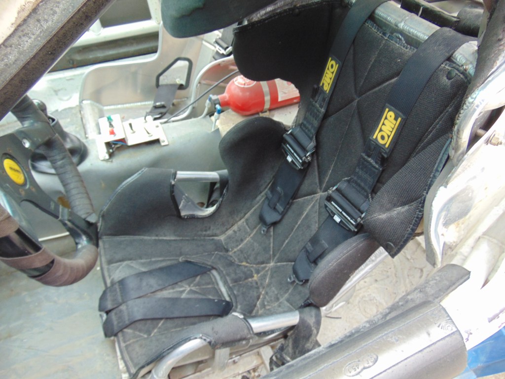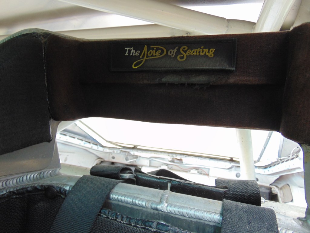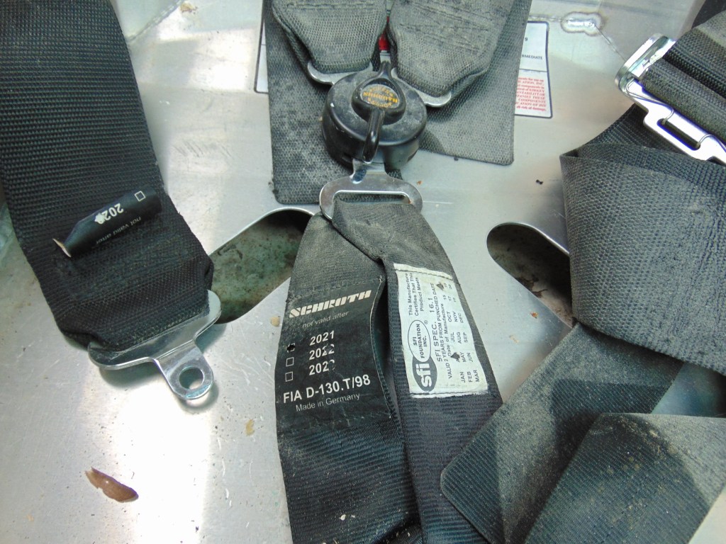 The car has a very robust drivers seat, as manufactured by TheJoieofSeating.com. I am 5’-7” and weigh 180 pounds. The seat was custom fit for my body. It is approximately 15″ wide at the hips. Sorry, either it will fit you or it won’t! The seat is fixed to the floor. There are pedal extensions on the 3 pedals. These stick out almost 4” and can be adjusted in 1″ increments, so if your legs are longer than mine (30” inseam) you could adjust them back quite a bit. Probably the most important thing for a track car is getting the seating and pedals in a good position. This can never be a one size fits all situation so be prepared to deal with this if you purchase the car. The steering wheel is removable. The passenger seat is sized for a “robust” individual. Both seats have 6 point harnesses. The FIA certification on both belts expires at the end of this year. The drivers harness is an OMP with the narrow straps required to use a Hans device. Which I absolutely recommend!