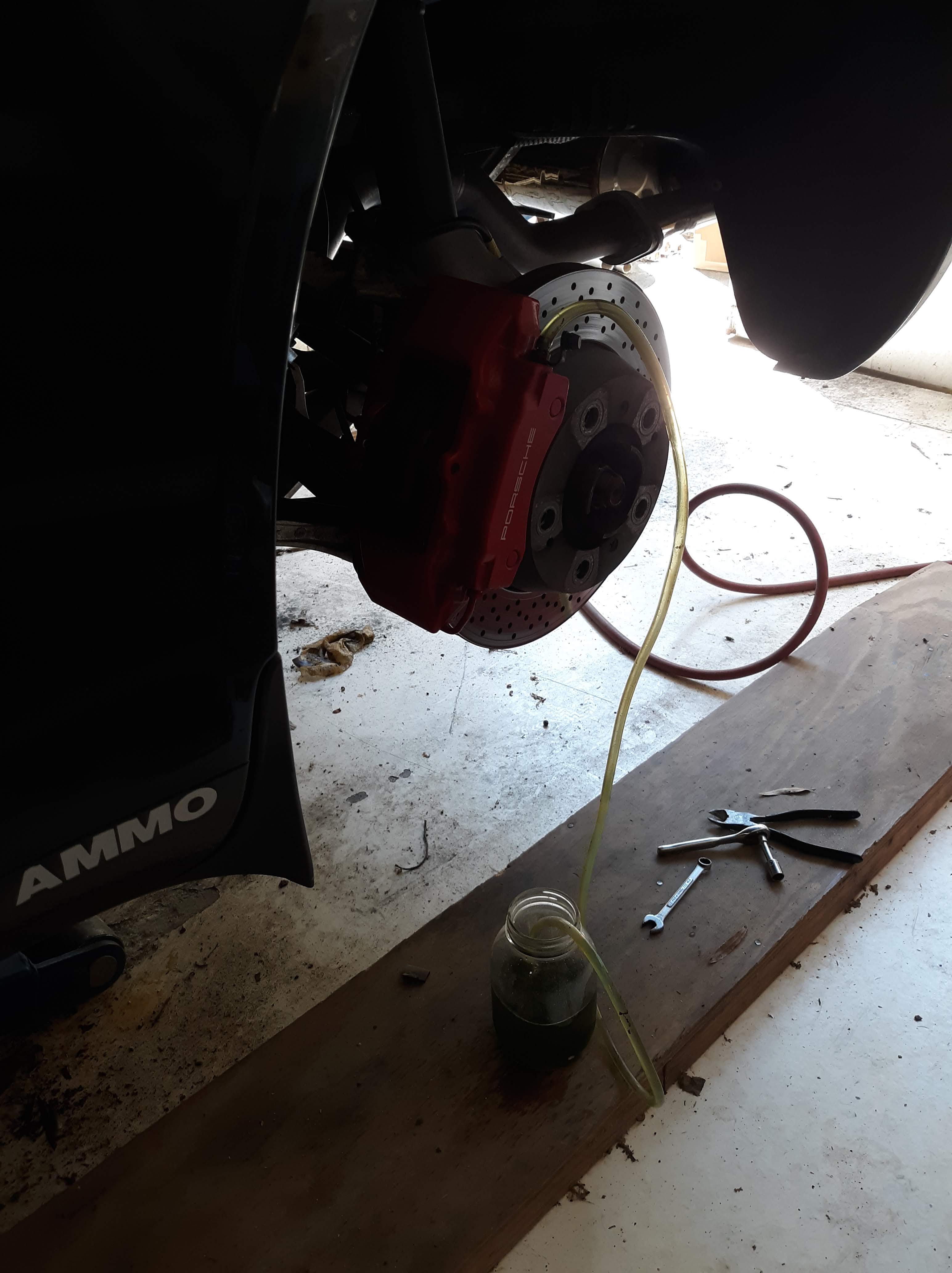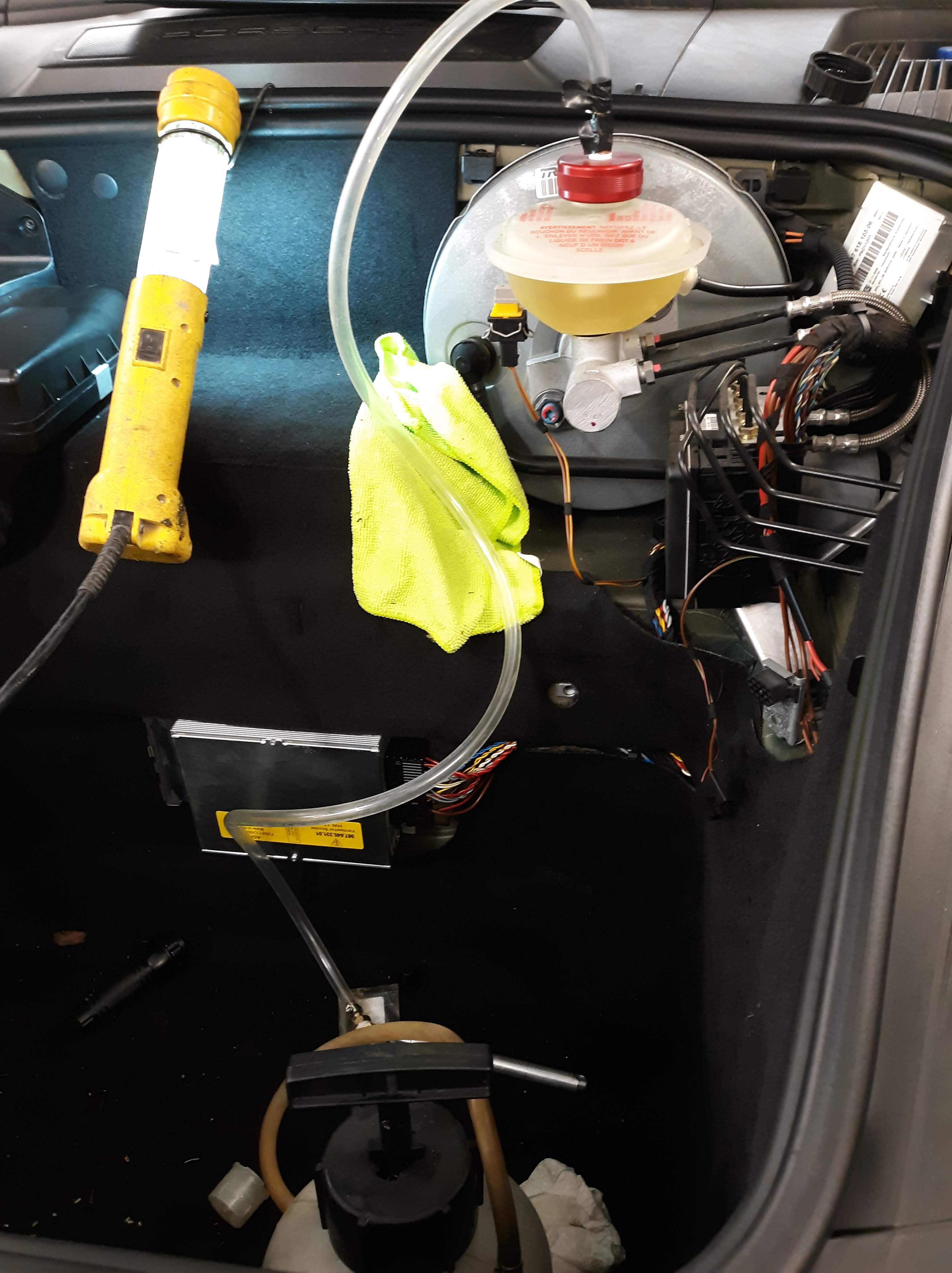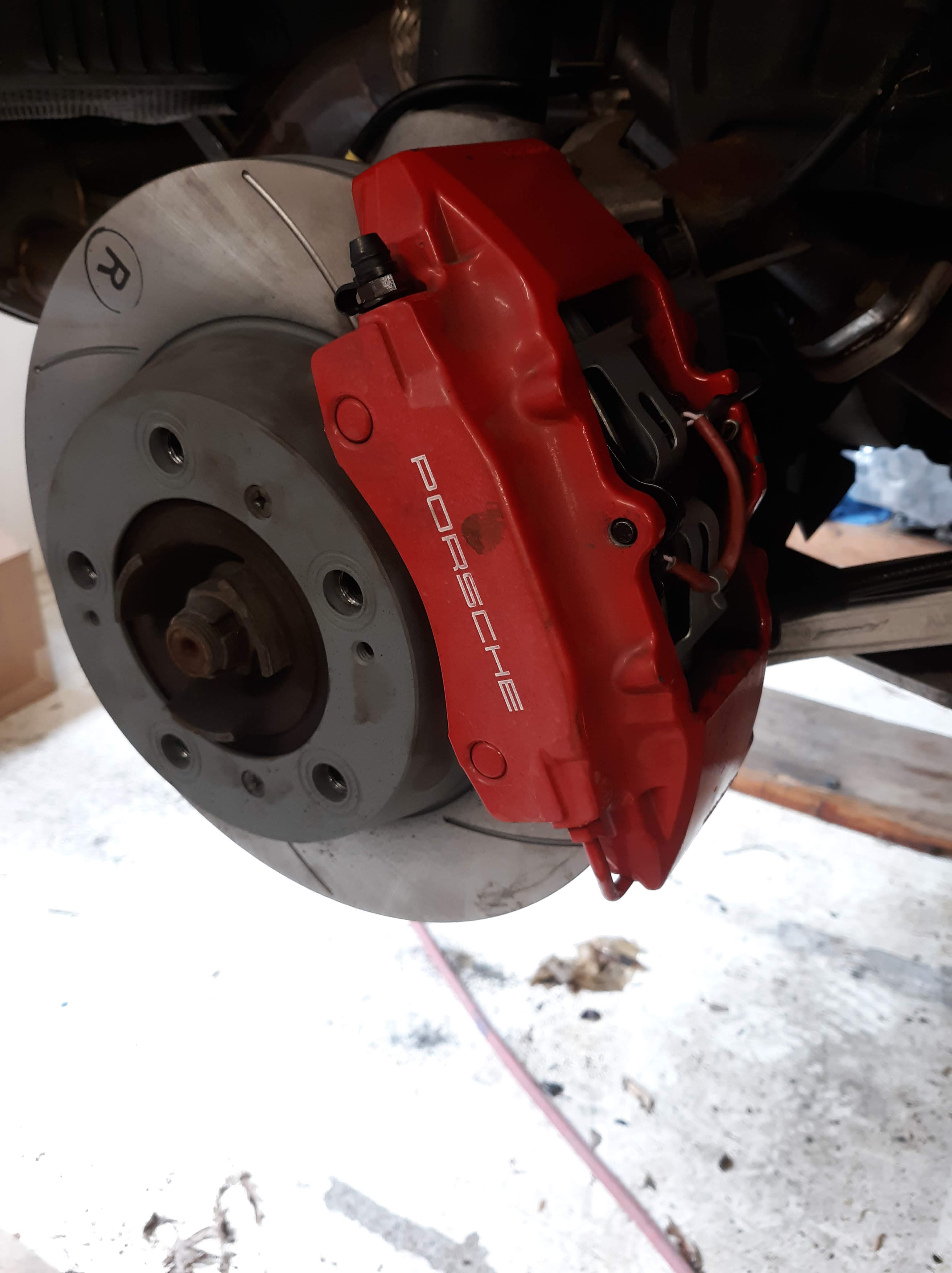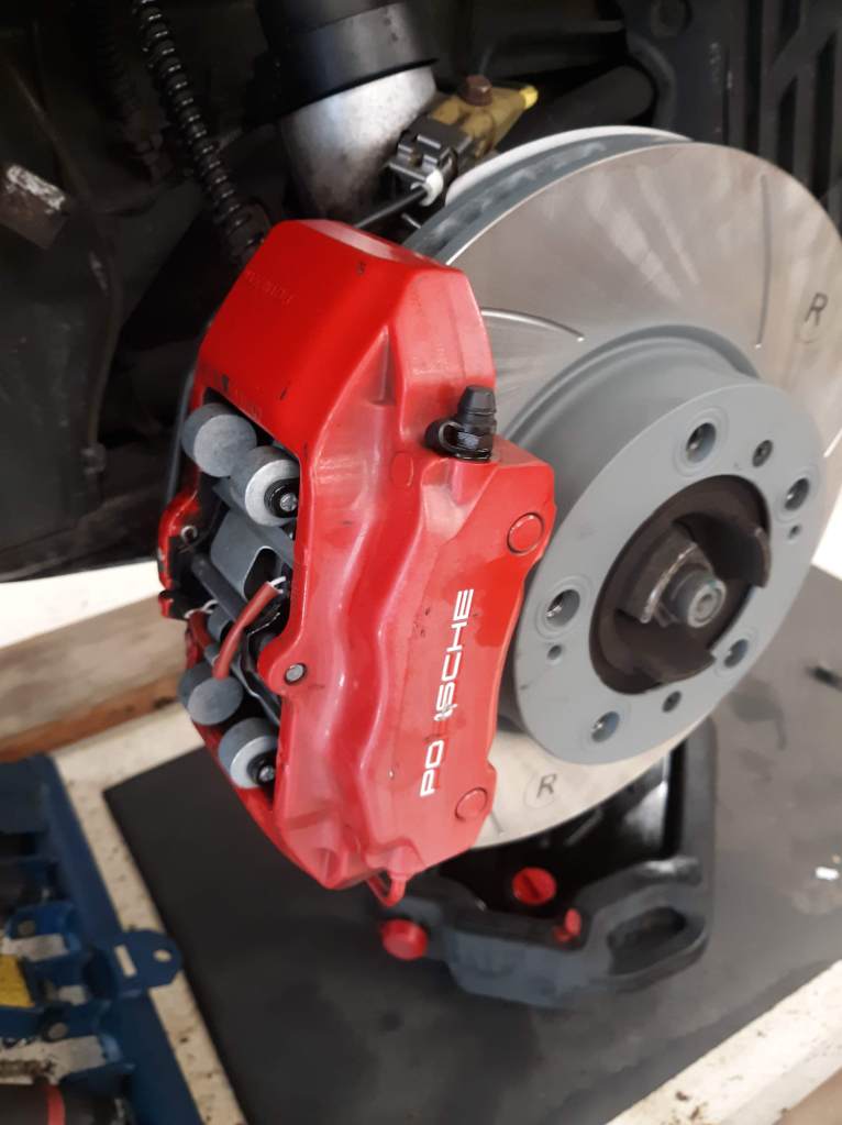 I pulled the car onto my midrise lift and pulled off the wheels. Sure enough, the brake pads were getting towards the end of their life. And the front calipers were below minimum thickness. There was plenty of life for a street car but I did not want to tempt fate with a track event coming up. So I ordered new parts. My mantra on this car will be to go with Porsche OEM parts, unless there is an overriding reason to do otherwise. In this case, after discussions with Jason at Paragon-Products, I decided to go with Textar pads, Sebro grooved (but not cross drilled ) rotors, new caliper attachment bolts, new pad wear sensors, and new caliper hardware kits. And I did a brake fluid flush, which went without incident using my Motive pressure bleeder. There were no special surprises. My only subtle tip is to use this opportunity to use a good quality electrical contact cleaner to clean out the connector plugs for not only the wear sensors but the ABS cables, at each wheel. The may just save you a random ABS warning light on your dash. I just completed a pad “bedding” run this afternoon, out on some back roads. I think the car is ready for its first track event.