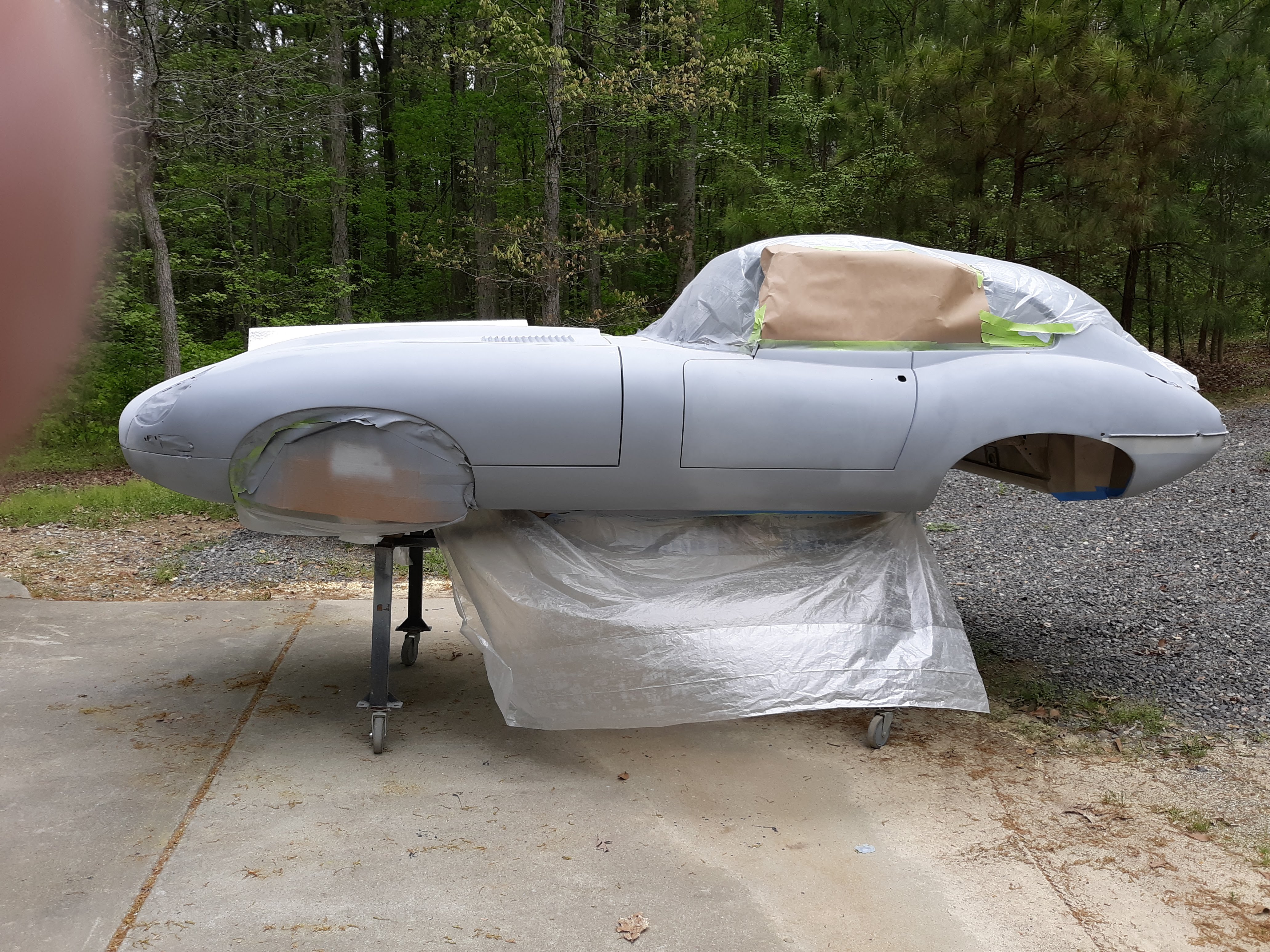 I probably need to back up a bit. Although the bonnet represented a major effort, I actually did it in the latter half of my body work project. I tackled the main body shell first. Although I talk about getting the body “straight”, there is really nothing straight on an E-Type body. The body shape was designed by Malcom Sayer. Sayer came from an aircraft background in general and was trained as an aerodynamicist. He wanted to design the E-Type to “cheat the wind”, in other words to slip through the air in the most efficient manner possible. I understand he used complex formulas to select the curvature of every point on the exterior with this goal in mind. I can’t tell if the fact that this also resulted in a drop dead gorgeous shape was just a coincidence or did he introduce some artistic license in the process. The end result is that there are no flat surfaces on the body. So getting the body “straight” in this case really means trying to reproduce the original curvatures. If you were starting from scratch this would be a tough thing to do. Fortunately most of my body and bonnet sheet metal pieces were in good condition, if not dinged locally by a life spent on the road and in parking lots. My paint and body work consultant ran his practiced hand over the sheet metal, pronouncing various areas as low or high. Almost no area was low or high enough to even see but I could certainly feel it, with his guidance.